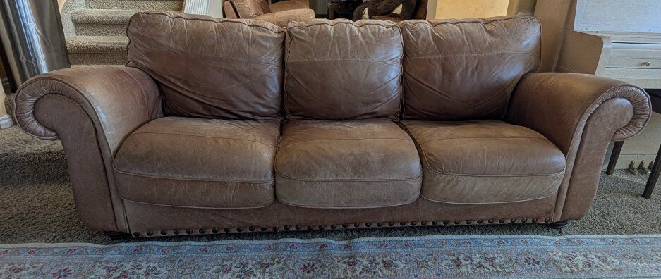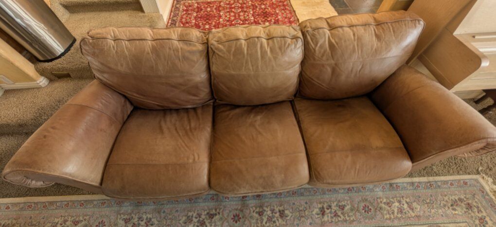VenmoSturdy, comfortable leather couch. High quality leather. Leather looks a little old, but it is in good condition without any tears.