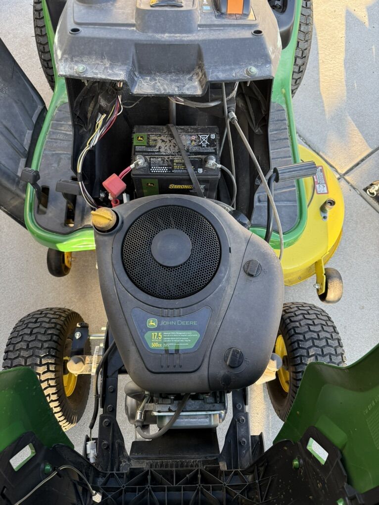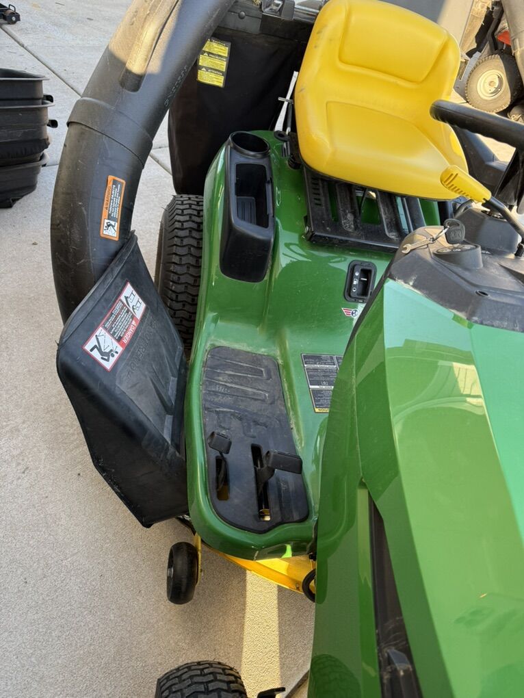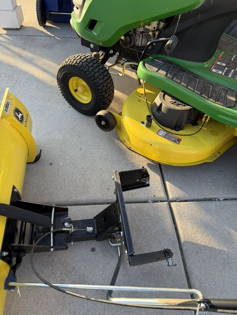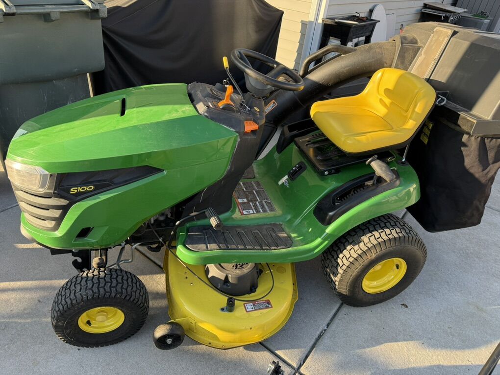 Runs cuts and drives amazing. Just got serviced and it’s ready to go. This package retails over $4000 with new bagger and new 46inch snow blade. The s100 only has 47 hrs. This machine has a 17.5 hp engine and a 42 inch cutting deck. Comes with a double bagger for your grass clippings also has the snow chains and weight bracket and weights.