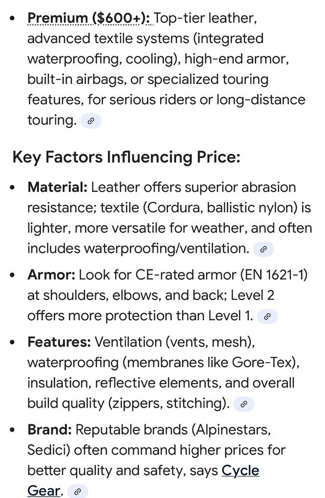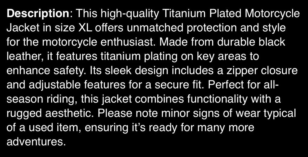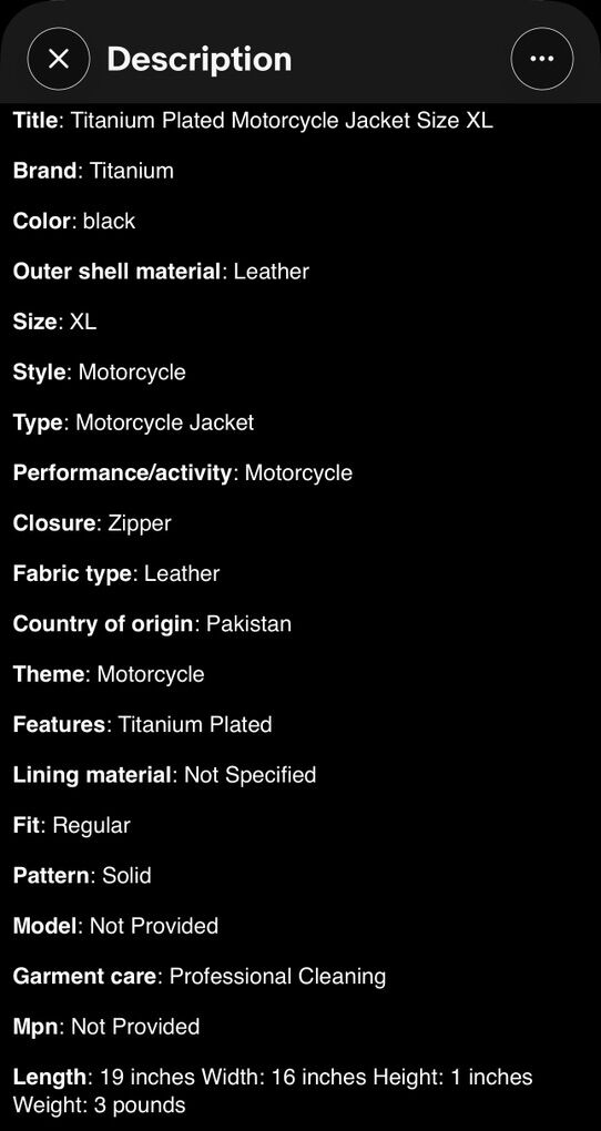 VenmoHeavy black leather with removable liner. Lots of padding and armor for high level comfort and protection. Size XL fits very good. Not my size so new condition. Highest quality jacket. Description is in the pictures. Cash or Venmo only. Thanks