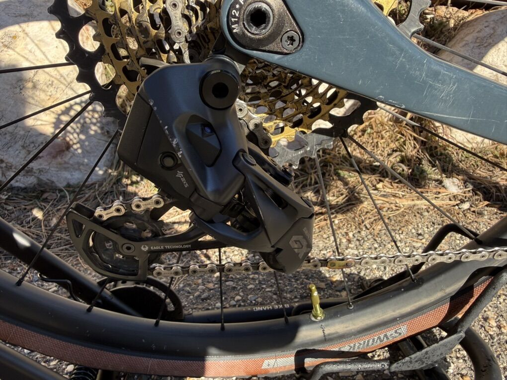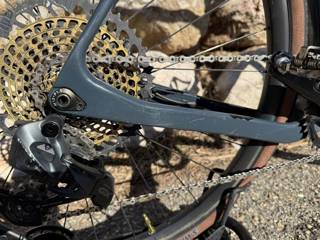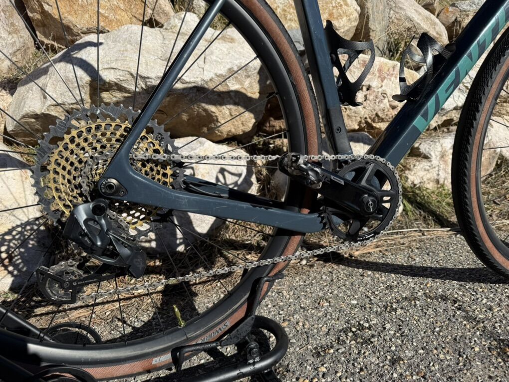 VenmoSRAM eagle drivetrain with eagle MTB cassette (10-52) Scribe gravel wheels Pathfinder 45 tires XTR pedals Rival left side power meter. Rival electronic groupset