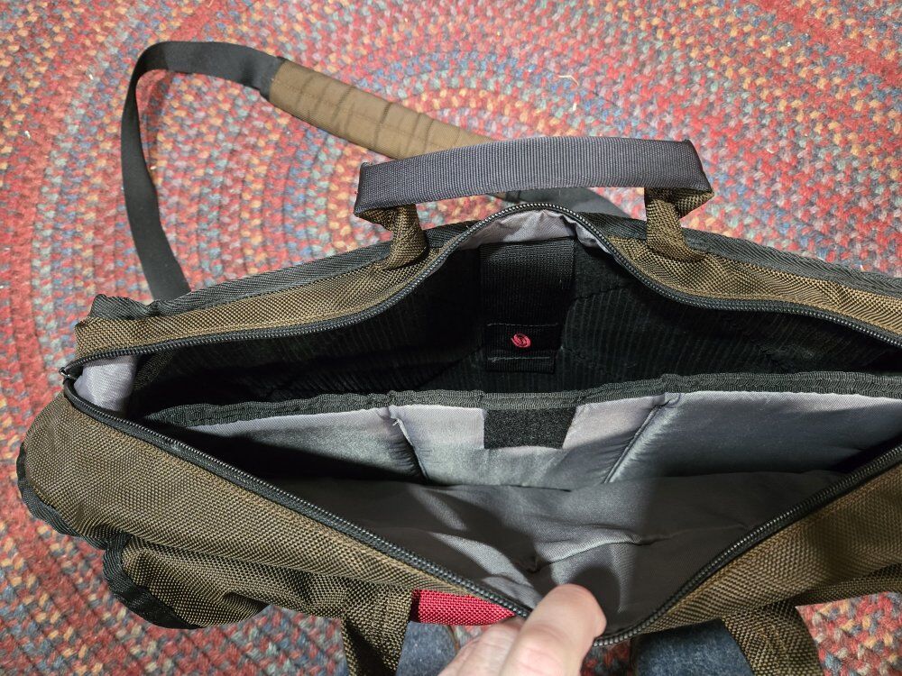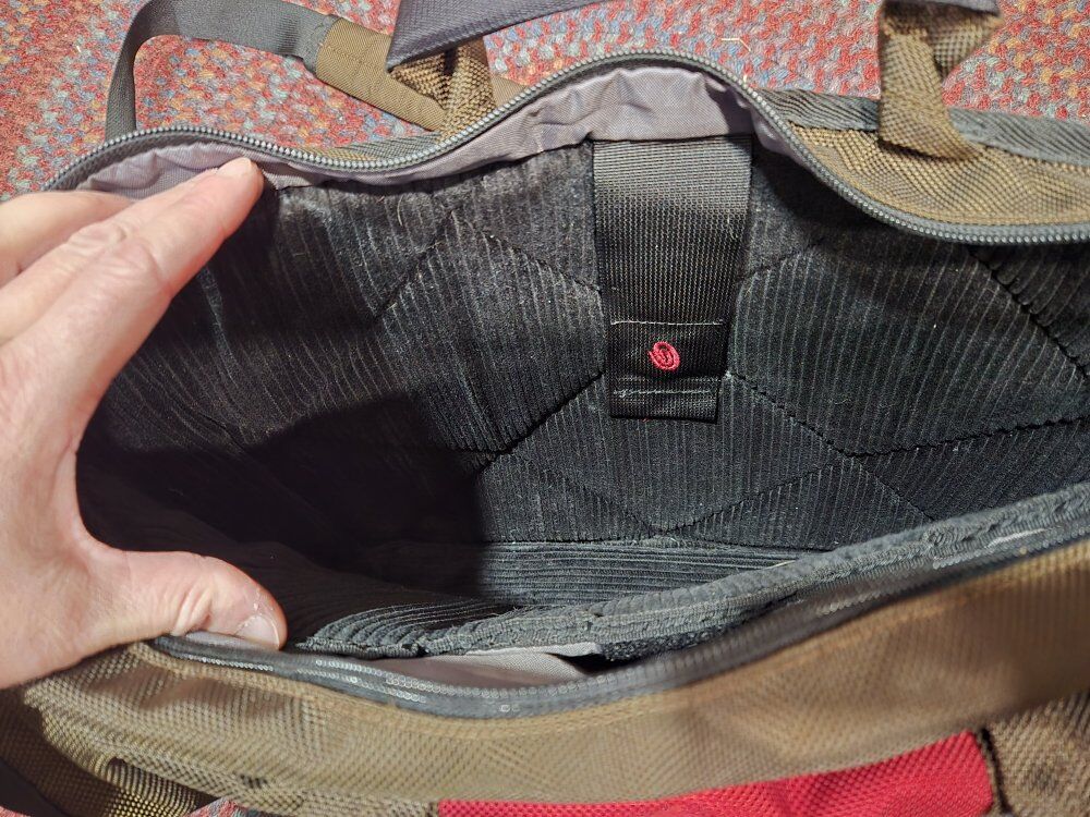 -corduroy-lined laptop sleeve and main compartment fits a 15" laptop -delightfully vintage padded cell phone pocket clearly designed for a Nokia brick -a larger padded pocket directly behind it for your modern phone
