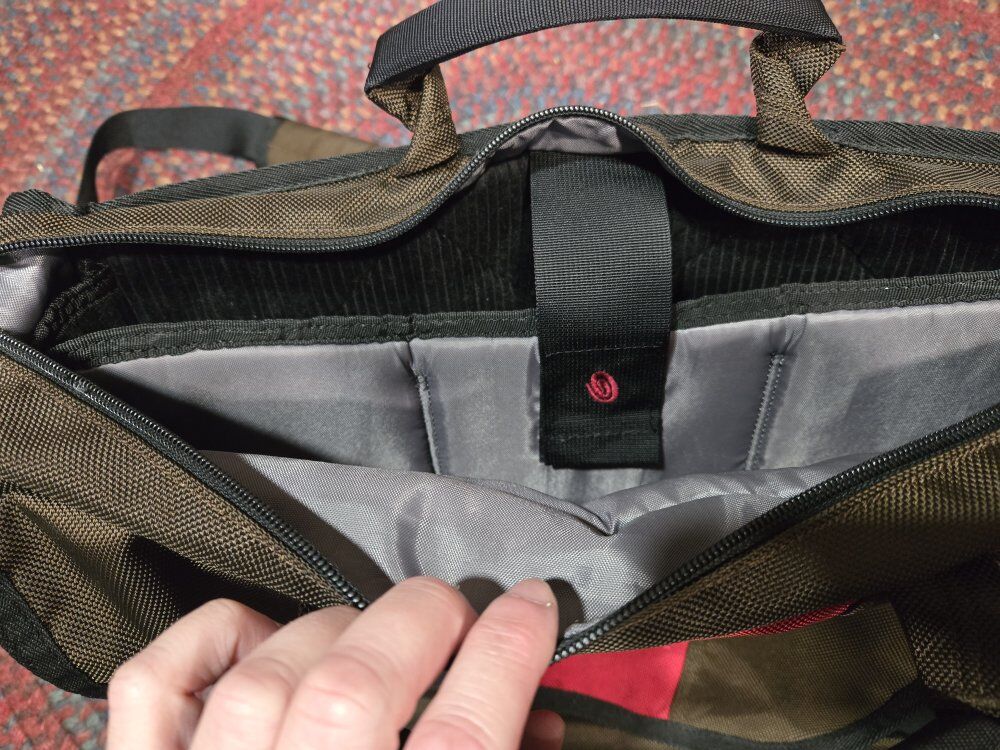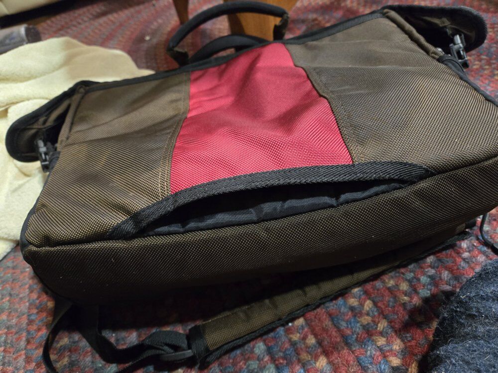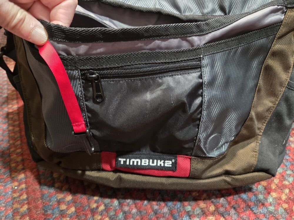 Delightfully androgenous and fitting for a mountain town in brown and cherry red with all the organization and design-thoughtfulness that Timbuk2 was known for before every millennial with a Kickstarter for a well-designed airport backpack decided they'd reinvented the wheel.