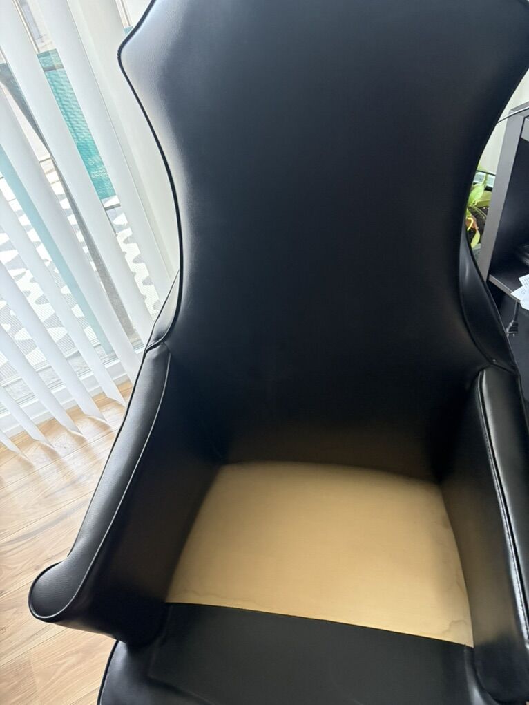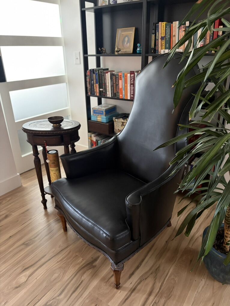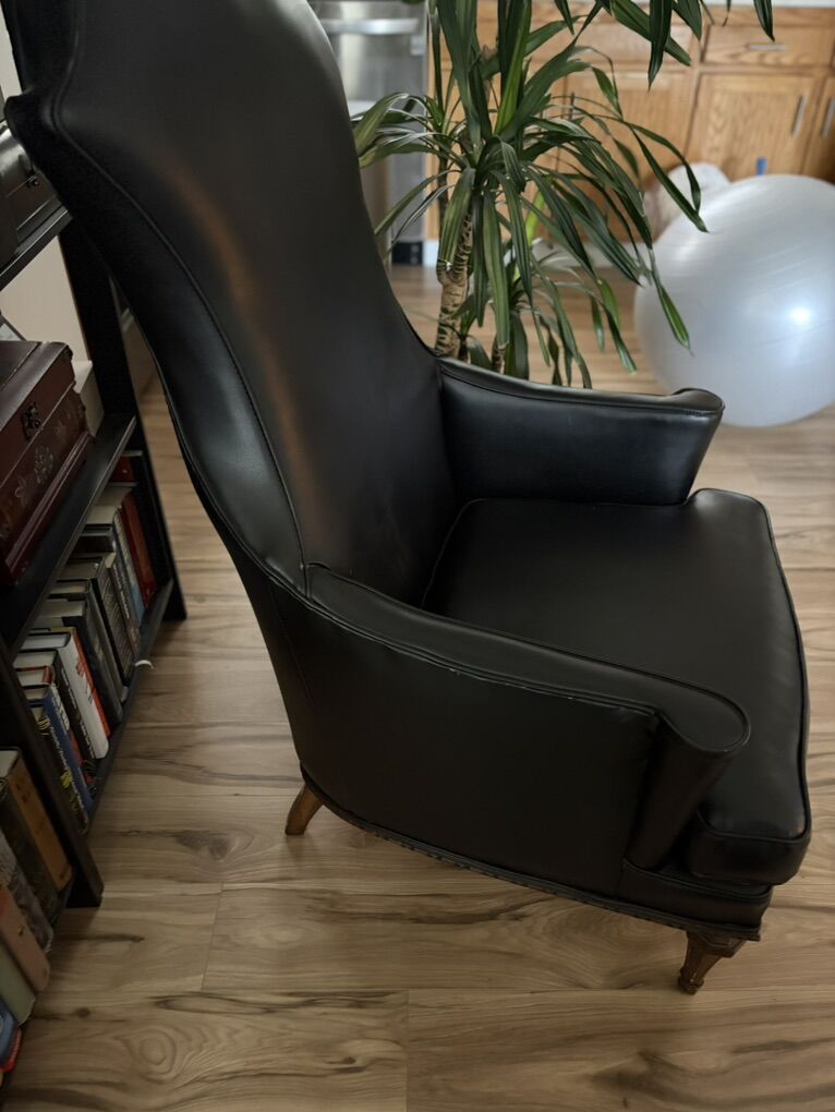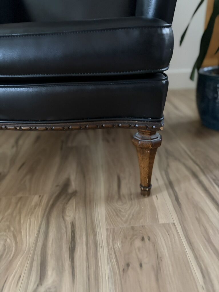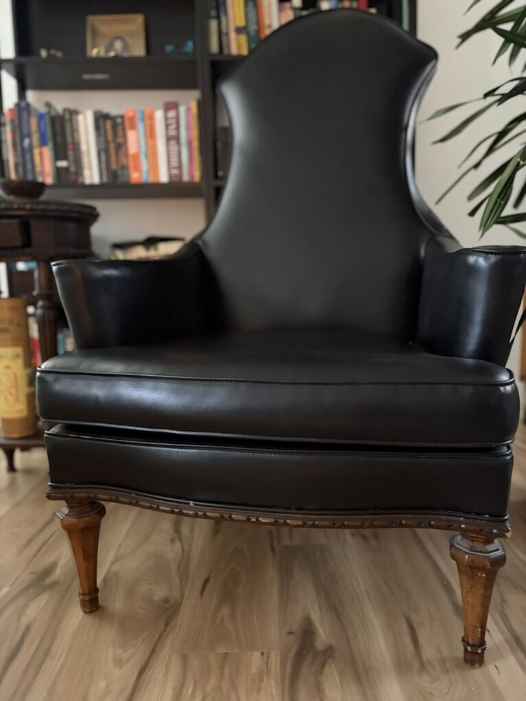 Antique chair with lots of personality. Sleek black vegan leather, walnut legs. Definitely antique and certainly sturdy. Add a dramatic flare to any room.