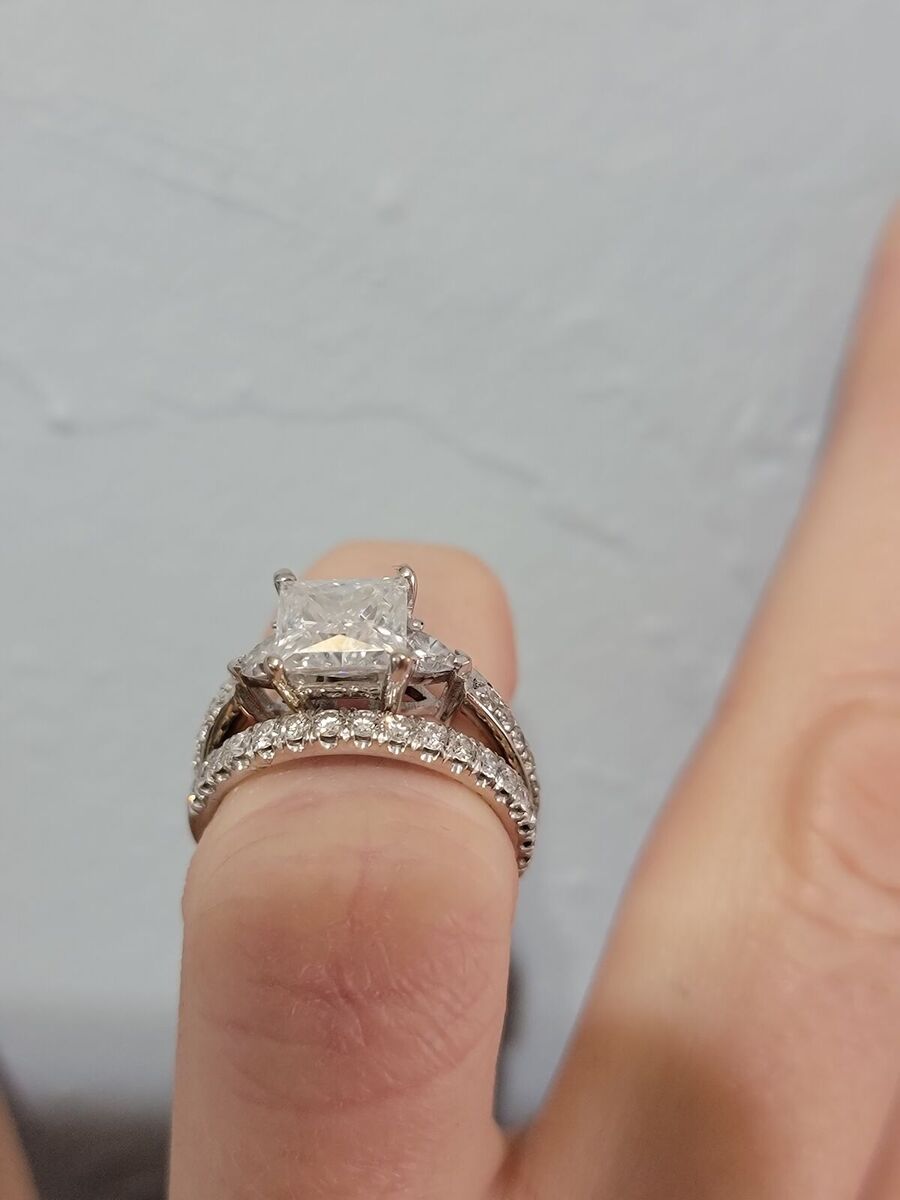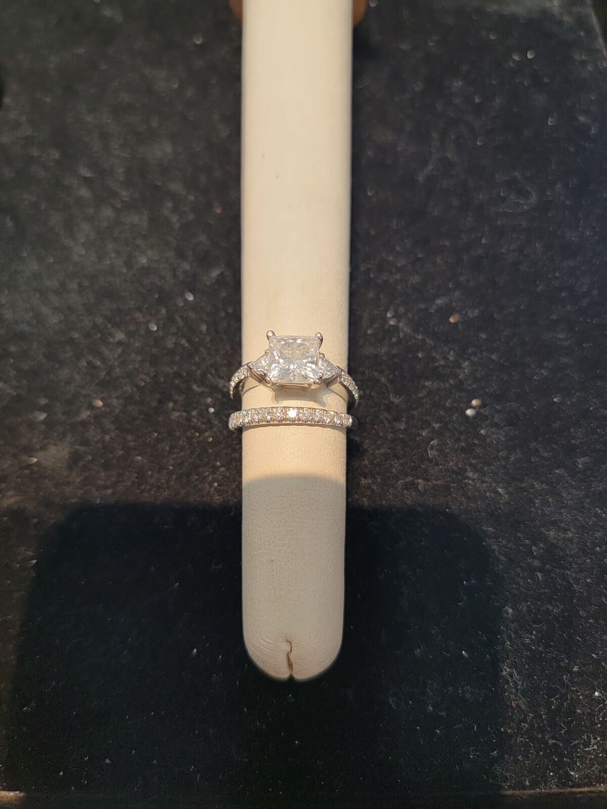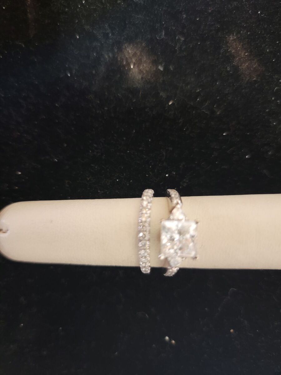 The wedding band, from Morgan Jewelers, showcases a brilliant 2.5 ct Moissanite stone set in 18k white gold, radiating sparkle and timeless sophistication.