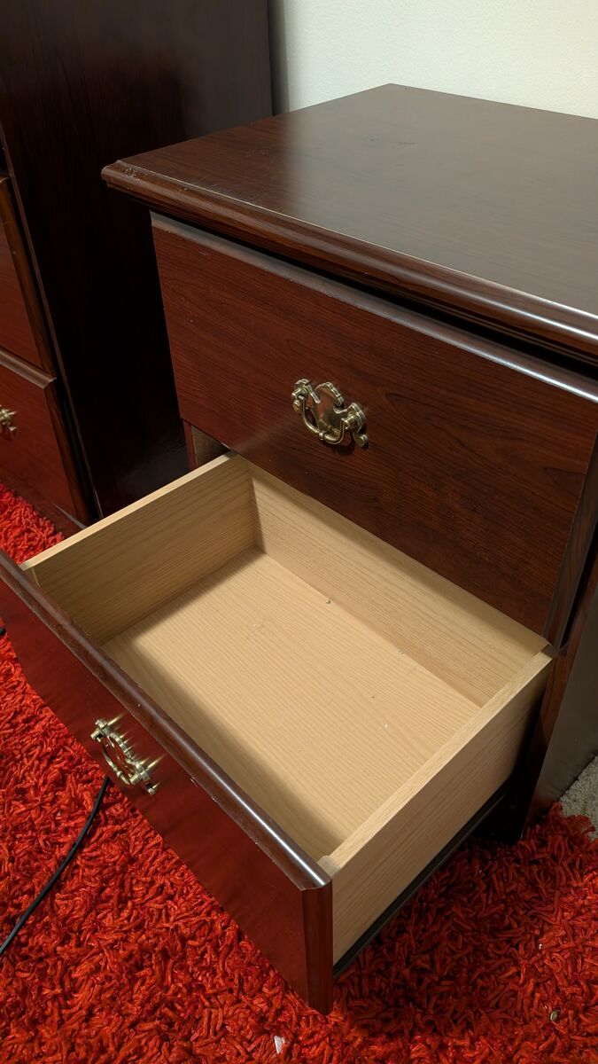 VenmoThis is a traditional two-drawer nightstand or end table with a dark wood finish and ornate brass drop pulls on escutcheons.