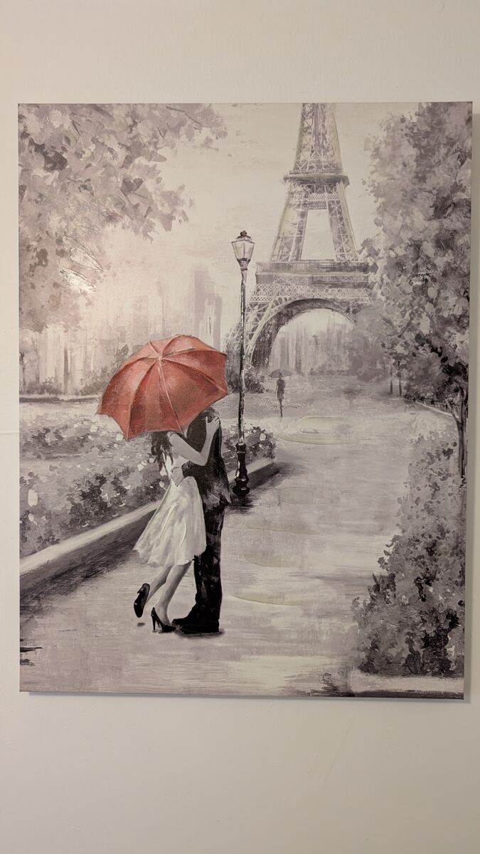 VenmoThe artwork captures a romantic scene in Paris on a rainy evening, with a couple sharing a moment or walking near the base of the Eiffel Tower.