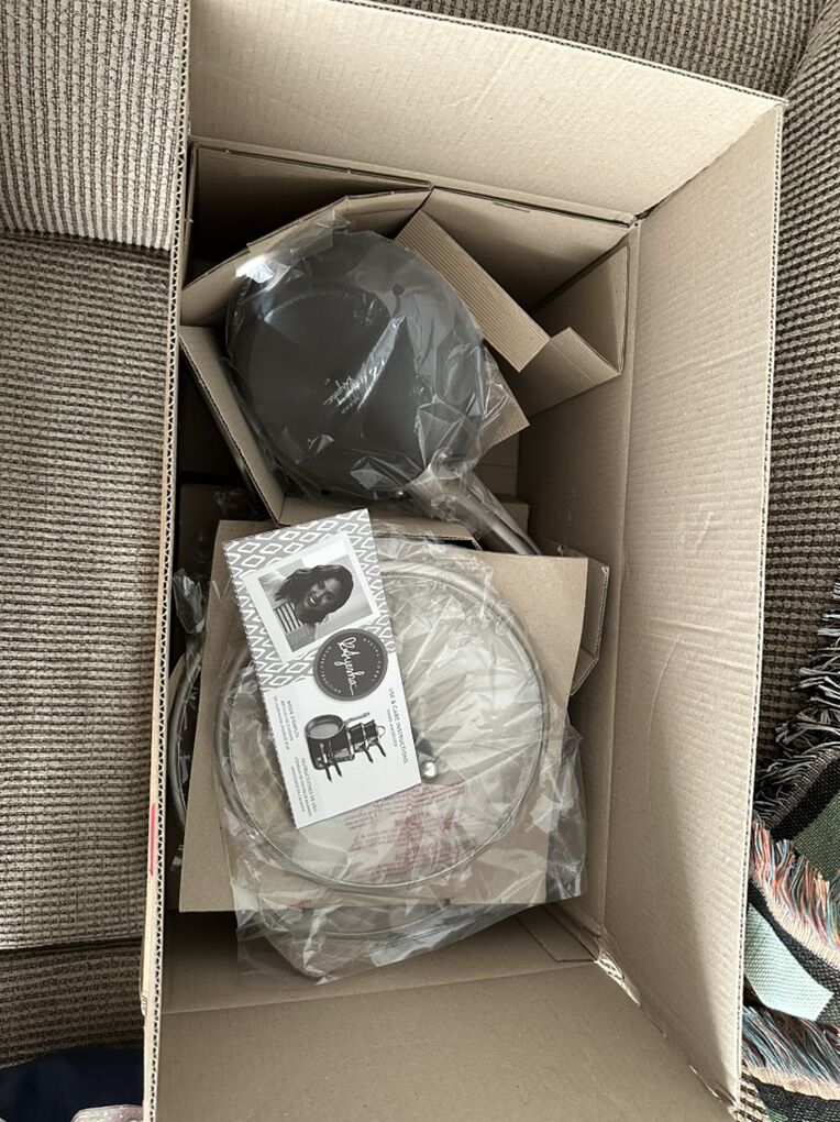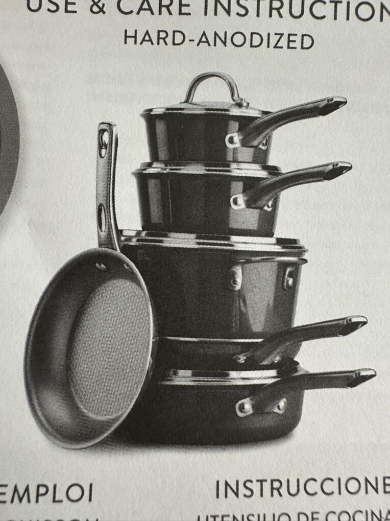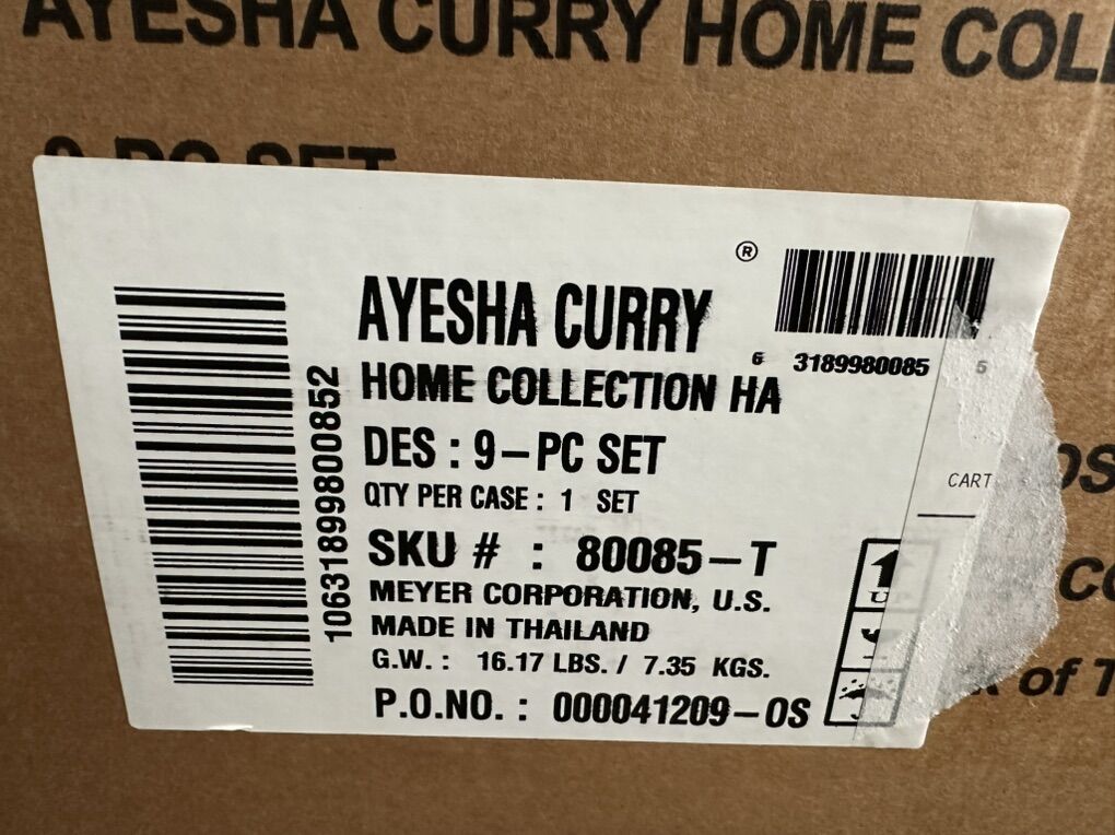 VenmoAyesha Curry Home Collection 9 piece set Hard Anodized Nonstick Cookware Pots and Pans Set Charcoal Gray Open box-still in packaging 1.5-quart saucepan with lid, 2-quart saucepan with lid, 5.5-quart Dutch oven with lid, 8.5-inch frying pan, 12-Inch frying pan with lid Oven safe up to 500 degrees F Nonstick stainless steel