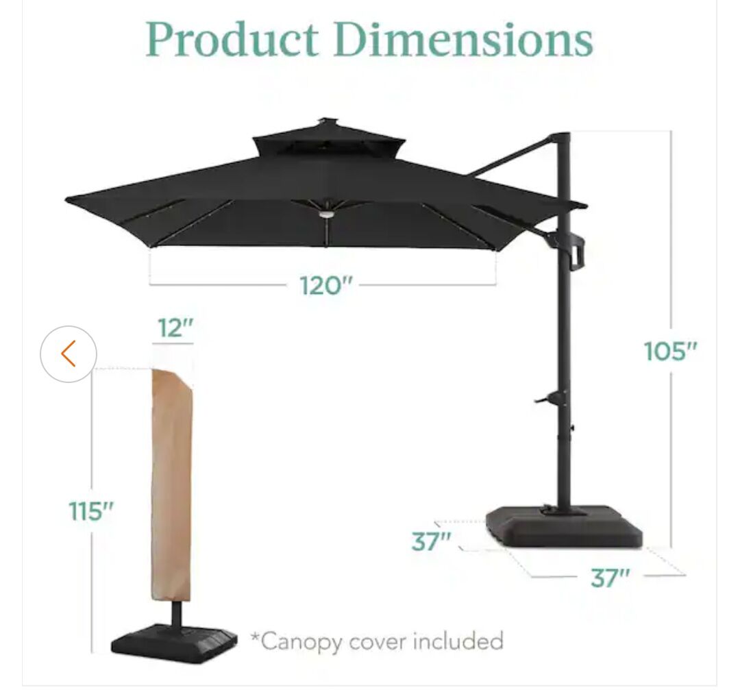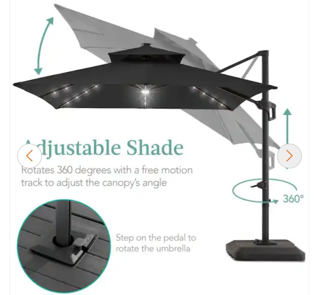 ZelleI have 2 brand new, in original packaging, Best Products 10' x 10' solar LED offset cantilever GRAY umbrella with base.