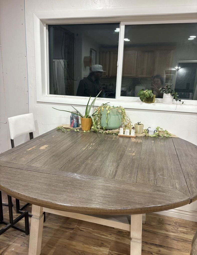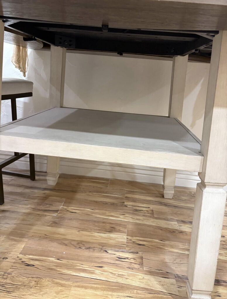 VenmoThis table is counter height and is being sold with 8 stools. As a square it is about 46”x46” and then each side can fold out to make a large circle. The top could use a little love but is still in great shape. There is also a shelf below the tabletop. Willing to sell the table and stools separately or all together. $350 for table and 8 stools. We have 4 yellow stools and 4 white stools.