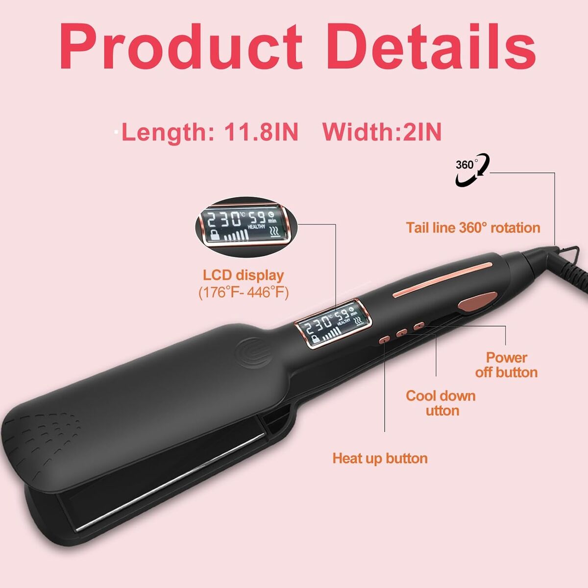NEW IN BOX! Ceramic and Tourmaline Hair Straightener, 2 Inch Wide Flat Iron Hair Straightener, 15 Temperature Settings, Easily Straightens Thick, Curly, Black, Natural Hair, Suitable for All Hair Types