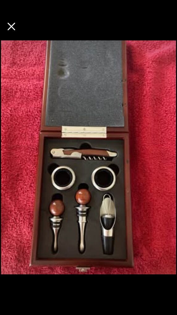 This is a Brookstone Heritage 6-piece wine accessory set in a rosewood box.
