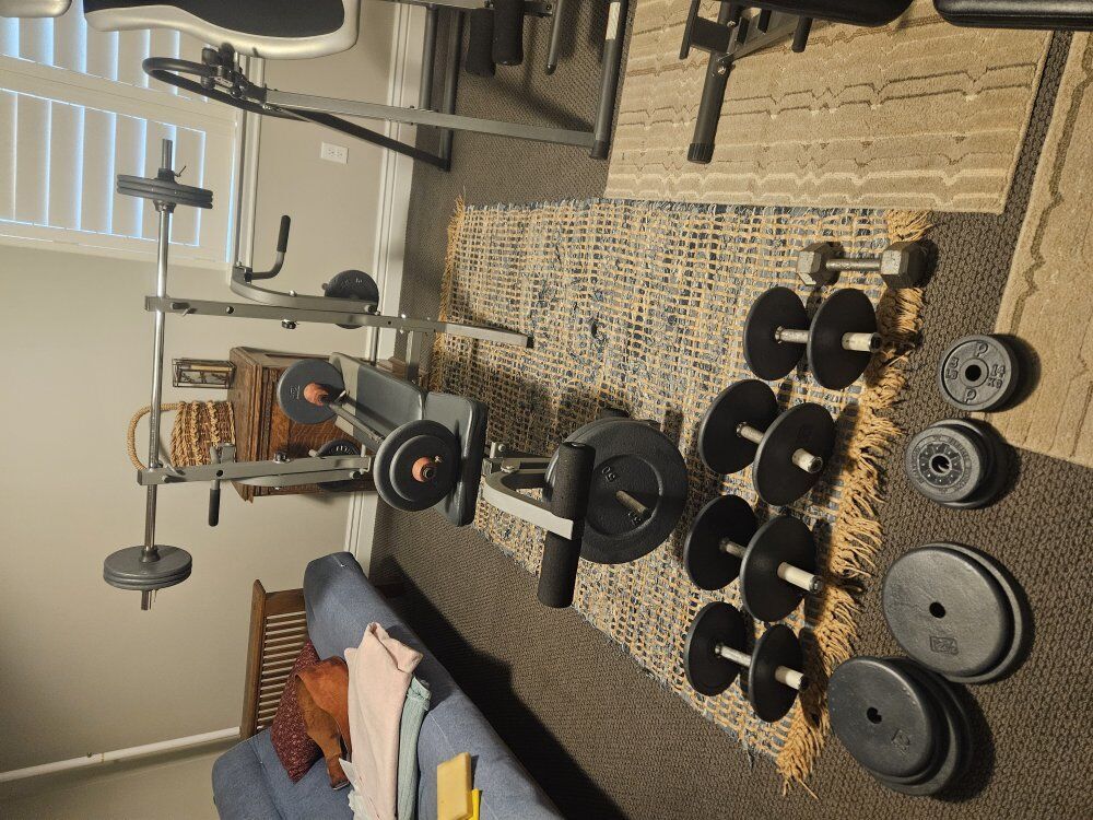 Bench press with legs and forearms. Incline bench. 5 dumbells, 2 barbells and 416 lbs of plates. (4 21/2's, 3 2's, 4 5's, 20 10's, 4 71/2's, 4 121/2's and 2 50's