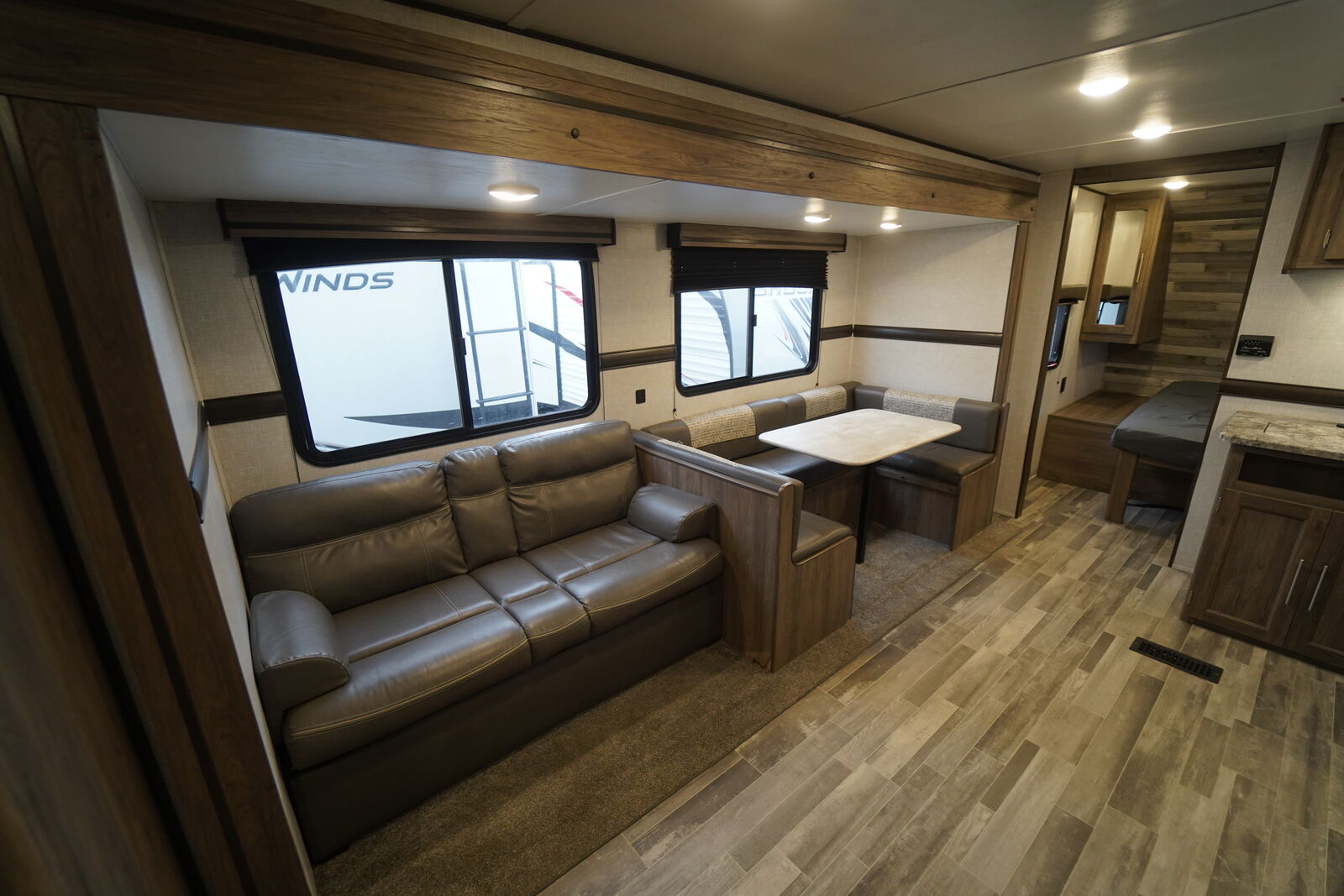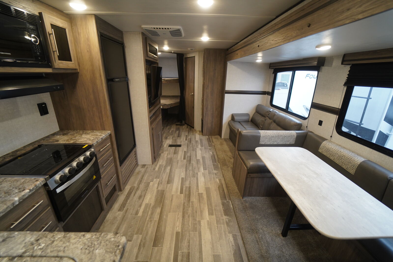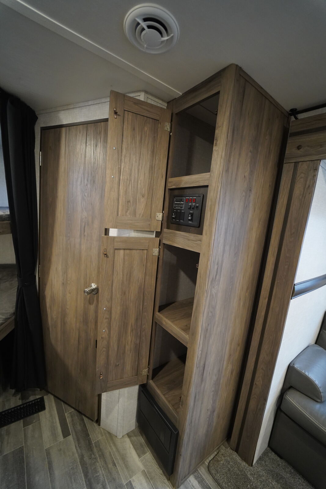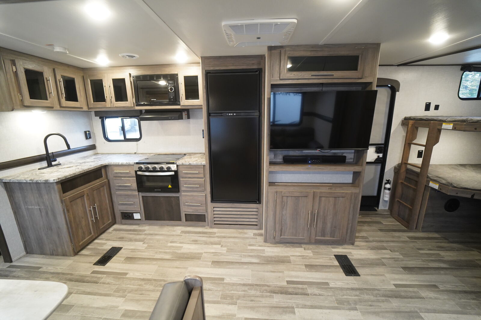 EXTREME WEATHER PACKAGE with UPGRADE UNSULATION! This is a SUPER CLEAN BUNKHOUSE WITH ALL THE GOOD FEATURES!!! OUTSIDE KITCHEN with OUTSIDE SPEAKERS and a BIG POWER PATIO AWNING for ENTERTAINING INSIDE AND OUT! Front queen suite with walk around bed, mid SUPER SLIDE housing a BIG U SHAPED dinette and a SLEEPER SOFA, FLAT SCREEN TV ACROSS FROM THE COUCH making a comfortable lounge area, rear corner double over double bunks and all enclosed bathroom!