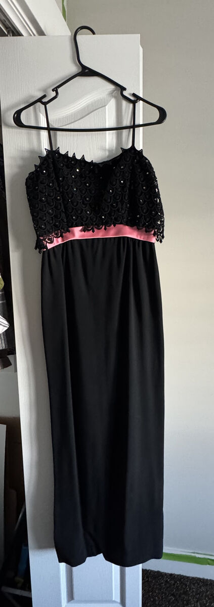 VenmoX-small black formal dress with an embellished bodice and a pink waistband. The top has intricate black bead/sequin detailing. Flowy floor-length dress. Available for try on and pick-up in Syracuse. Only accepting cash or venmo.