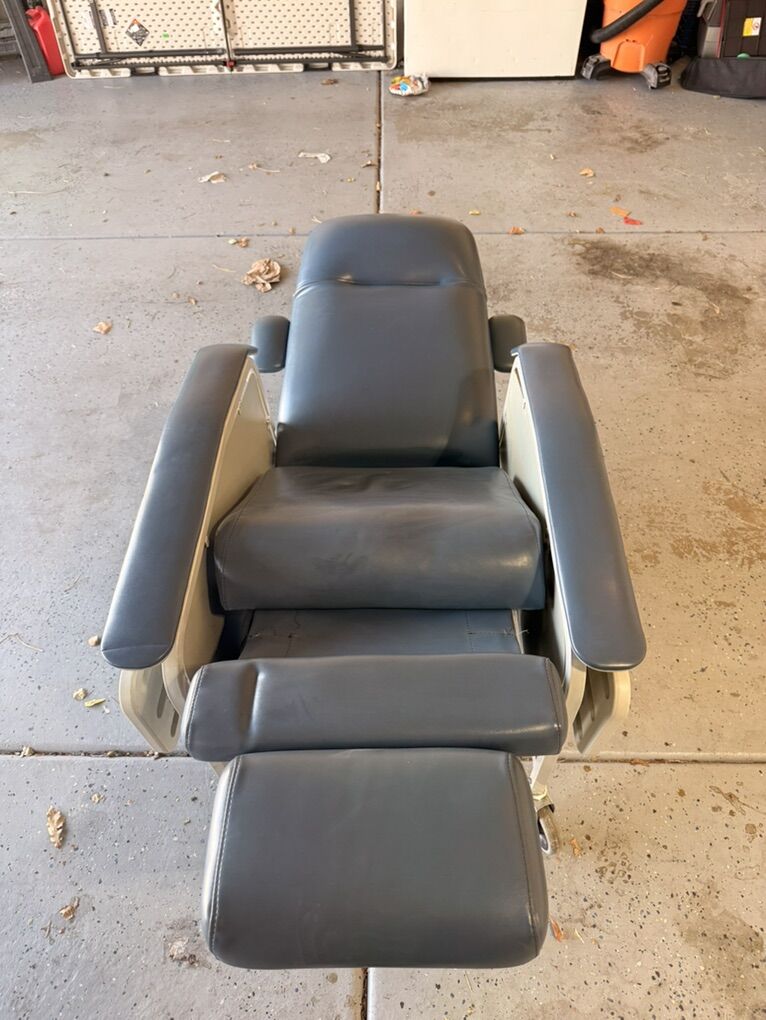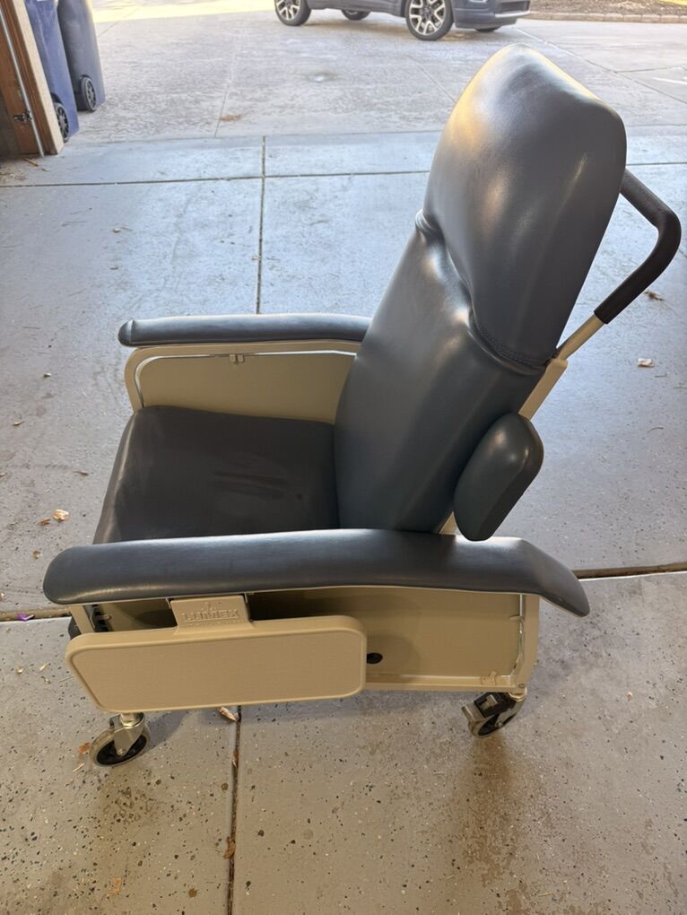 VenmoBlue hospital recliner or Geri Chair is great for reclining. Made with vinyl for easy cleaning It is on rollers with locks and is in good condition/
