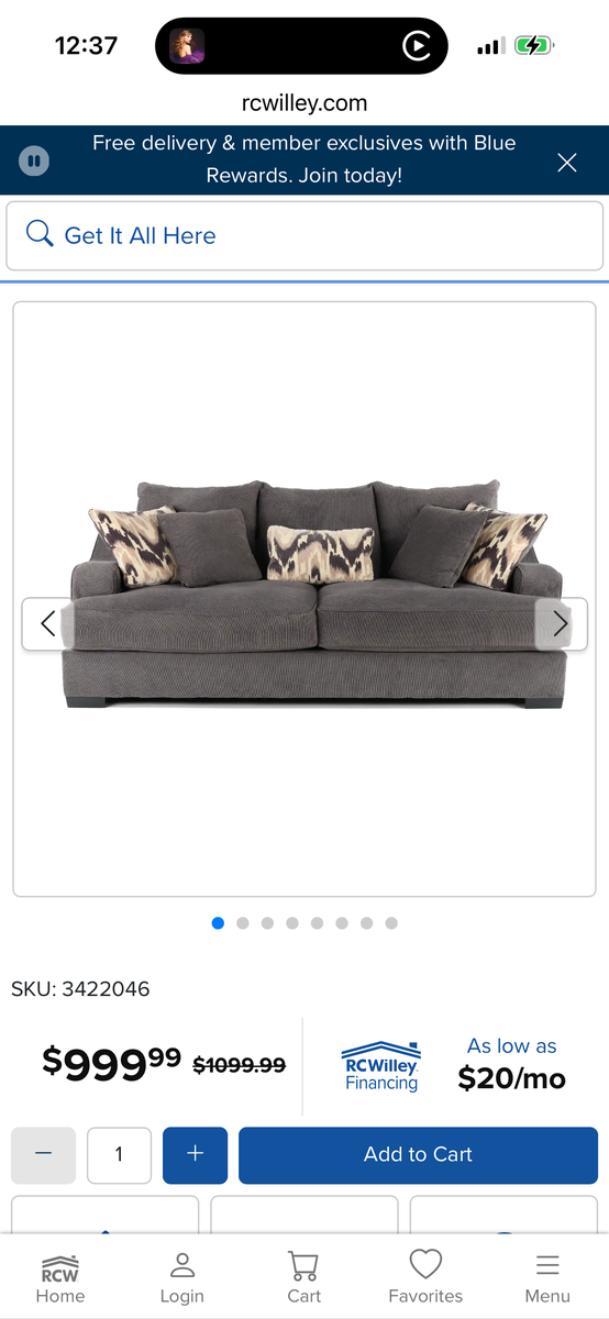 VenmoWe bought this couch from RC Willey and it is oversize. It has not worked out for the place we intended it to be in our house. It is very comfortable but too big for our space.
