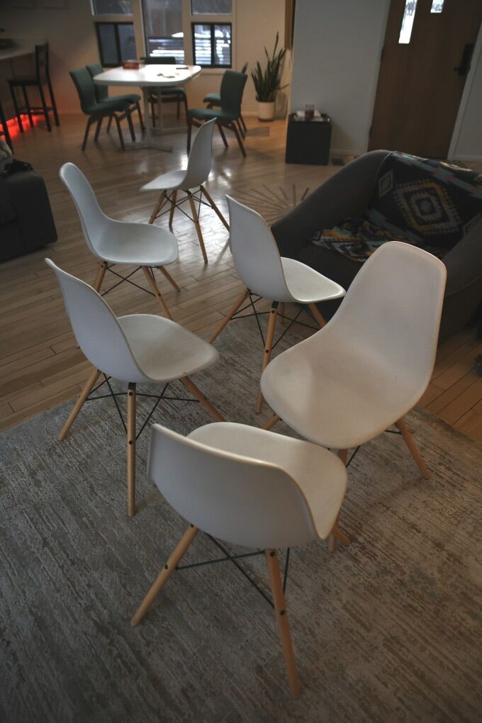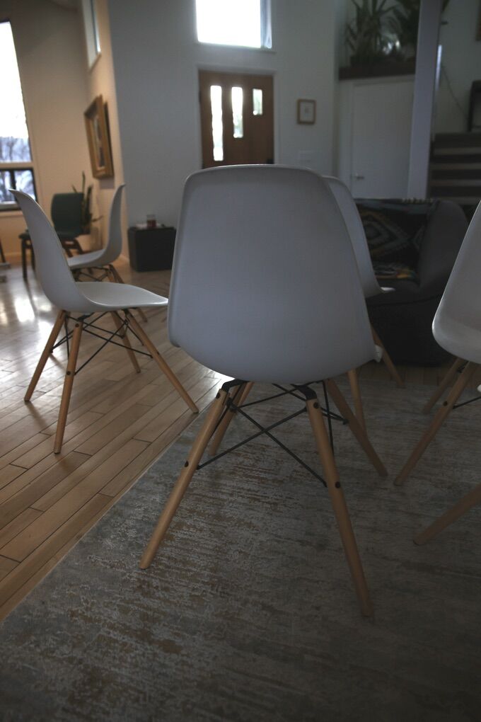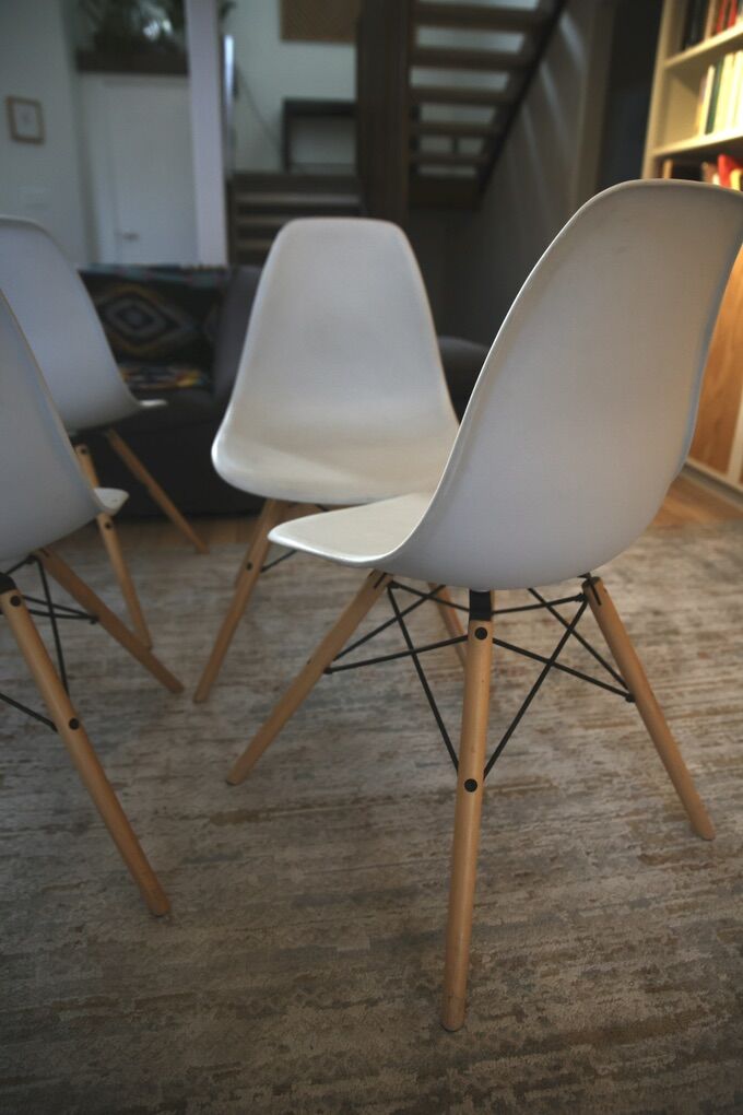 VenmoEames-style modern dining chairs with wood dowel legs and black metal framing. These are in great shape with no damage or loose components. We have had them for about 5 years and are letting them go. We got cushion dining chairs and have no need for these.