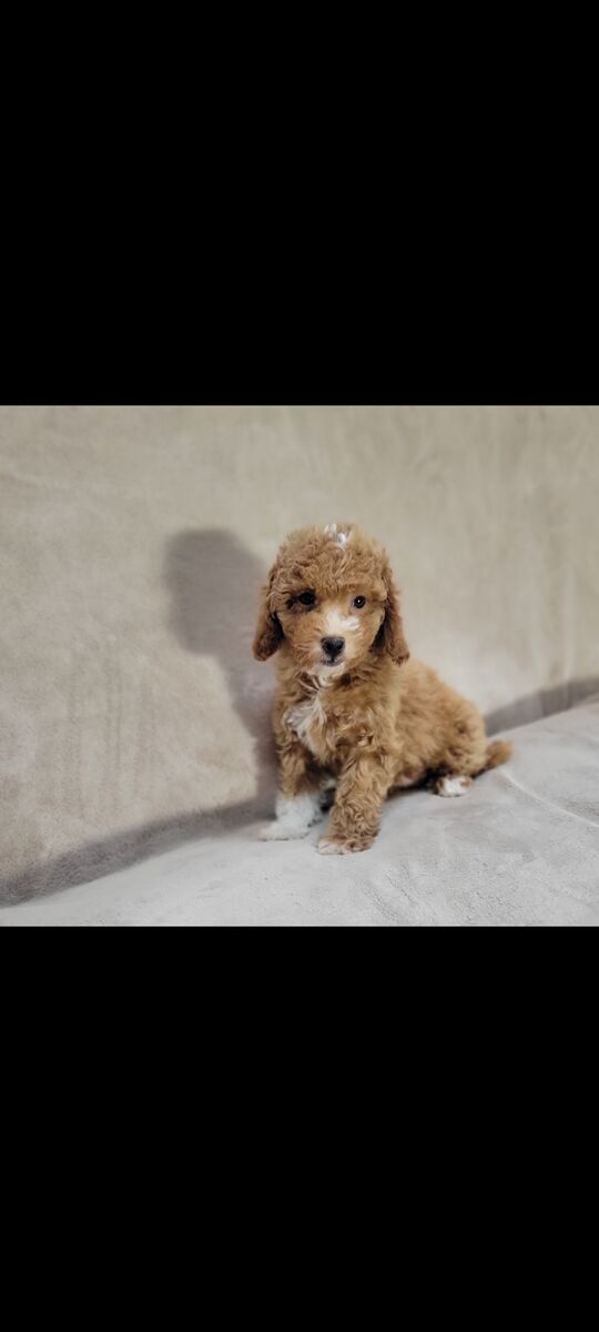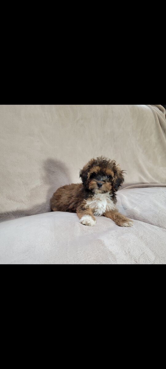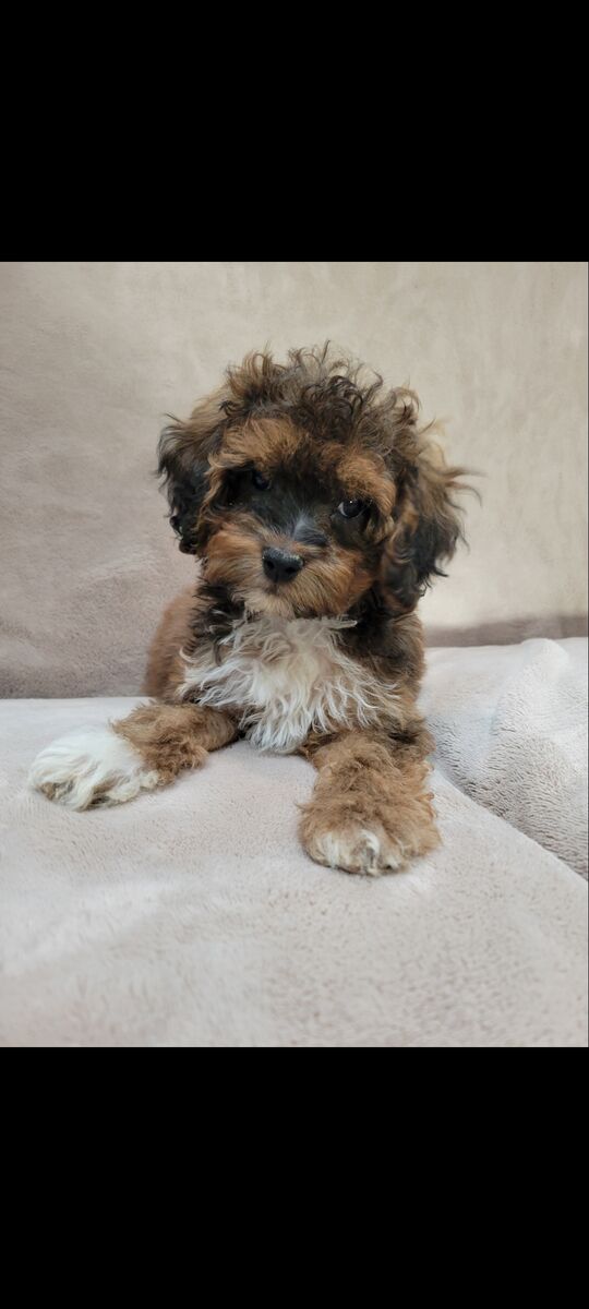 We have 1 girl & 4 boys. We have got them microchipped, vaccinated, & wormed. They are starting on crate training & potty training. They have been raised with our kids and have been loved & adored since birth. Dad is an Akc mini poodle & is 14lbs. Mom is a 12lb cavapoo. They are both super smart & very well trained. Dad & Mom are the last 2 pictures.