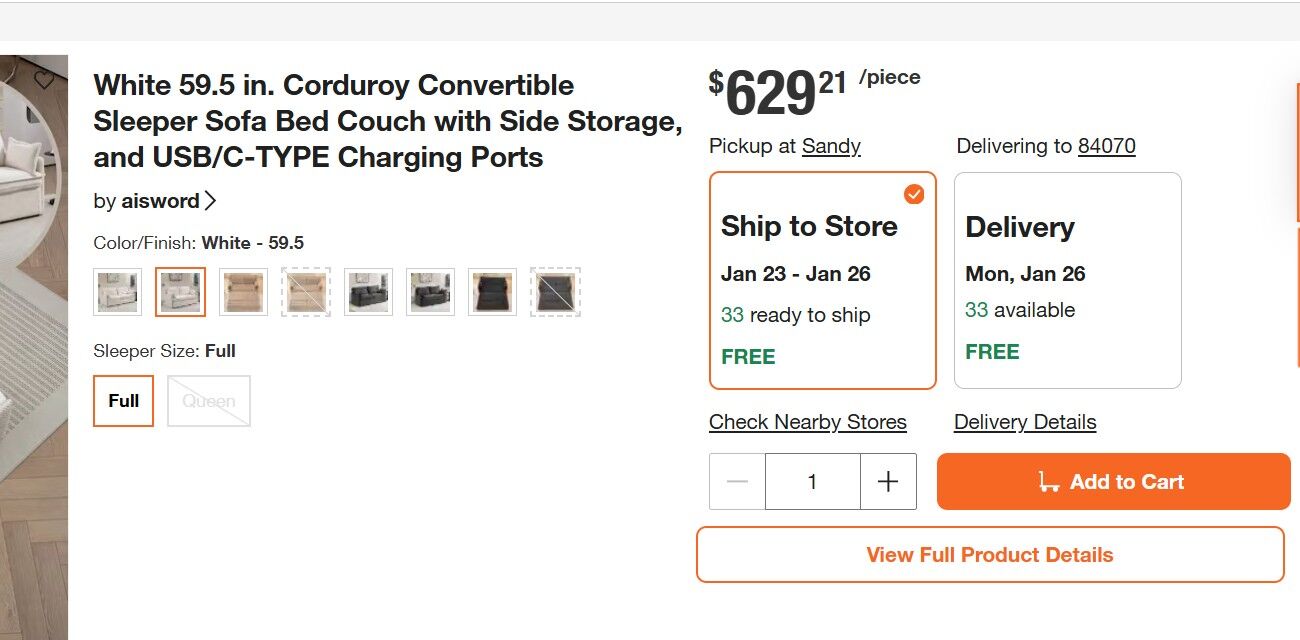 PayPalRetails for $629.21 at Home Depot and other retailers (corduroy fabric )