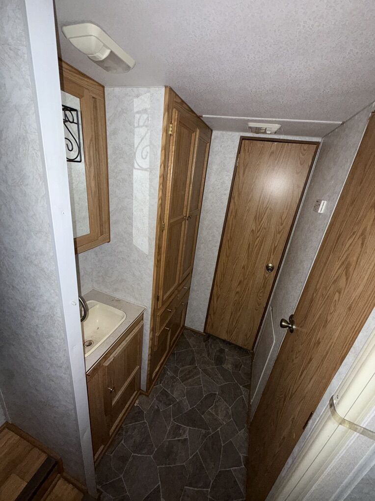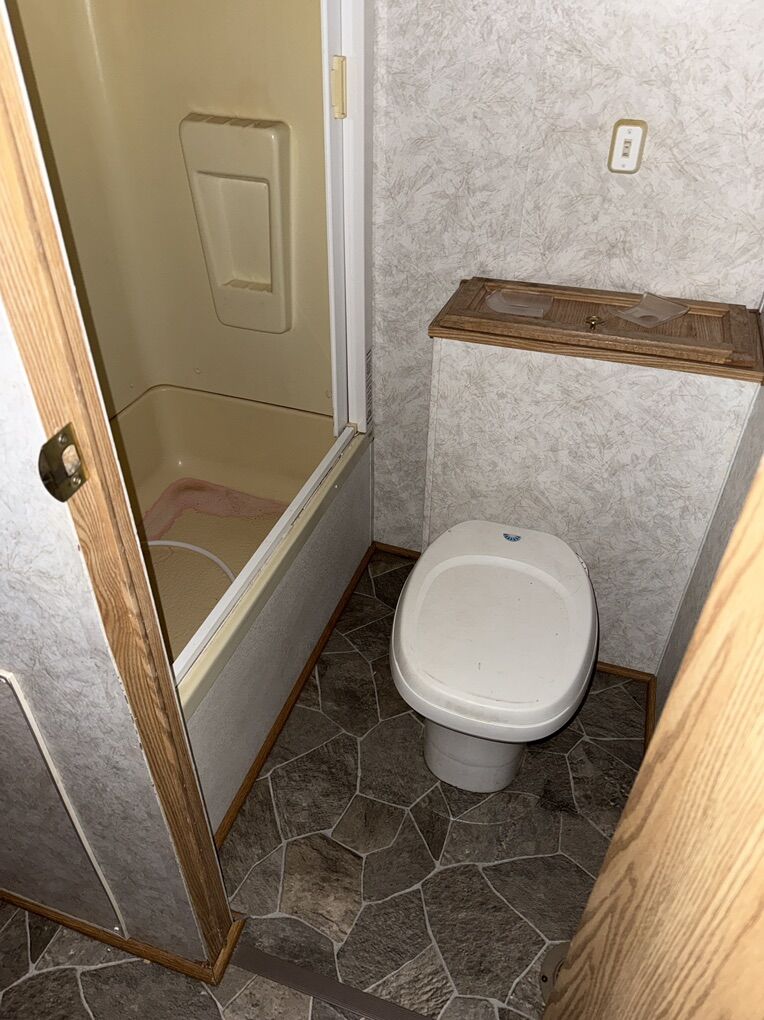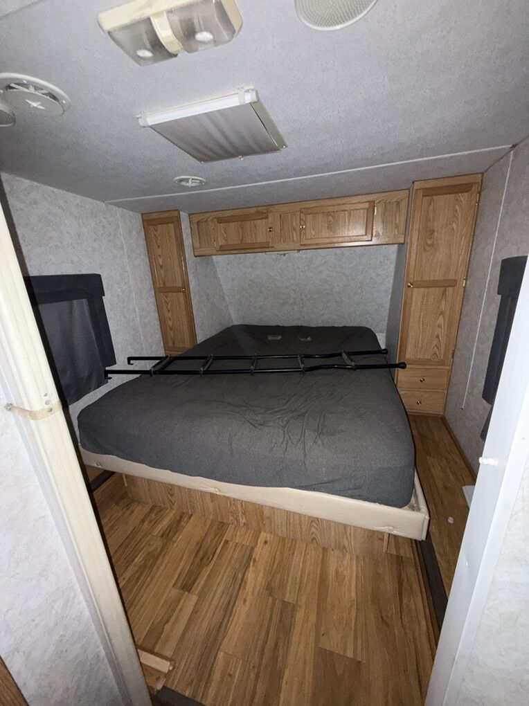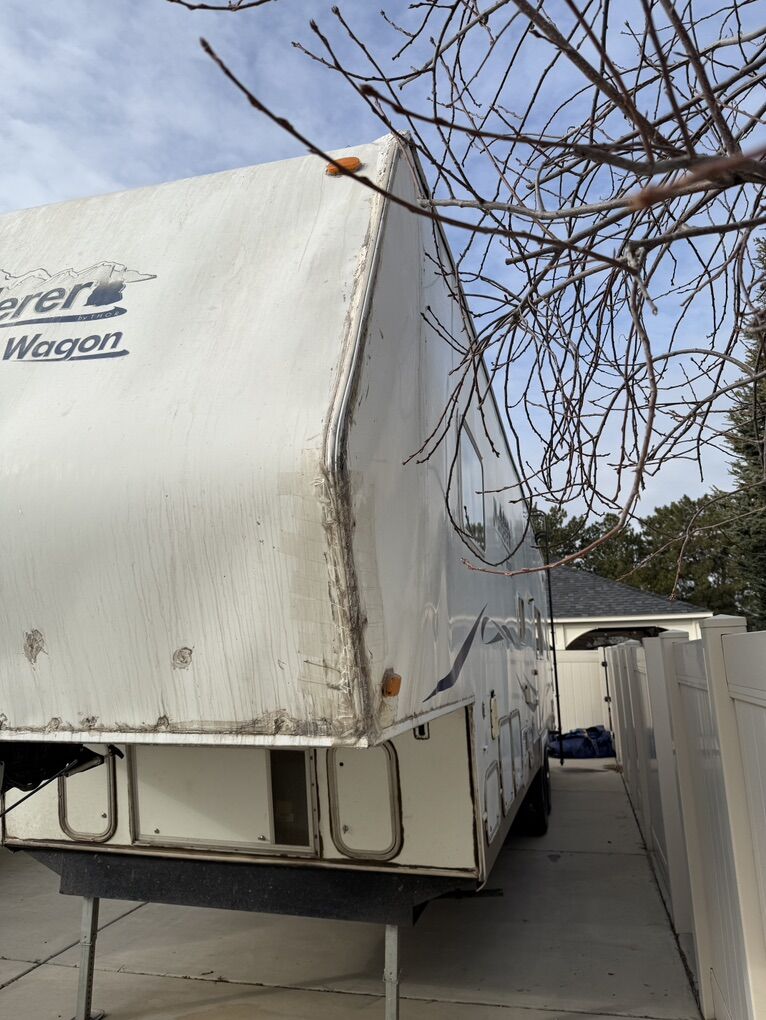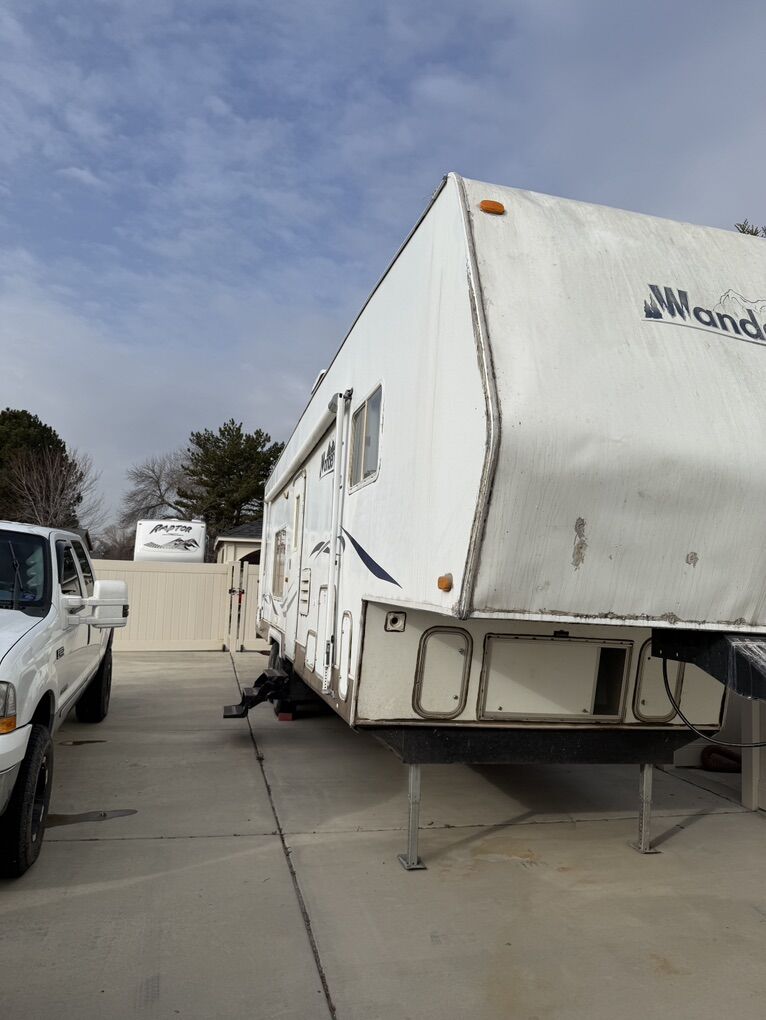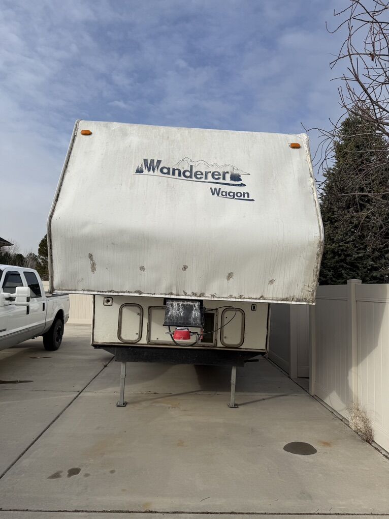 Selling our Wanderer Wagon fifth wheel toy hauler — perfect for someone looking for an affordable camper, hunting cabin, or weekend getaway setup. This is an older camper and does need some cosmetic TLC, but it has a lot of potential. Perfect for someone handy or wanting a project camper to fix up -front cap delaminating -right side panel came off when driving down the freeway (we tapped that down temporarily but it’s held up) -sealed the top right roof to stop a small leak