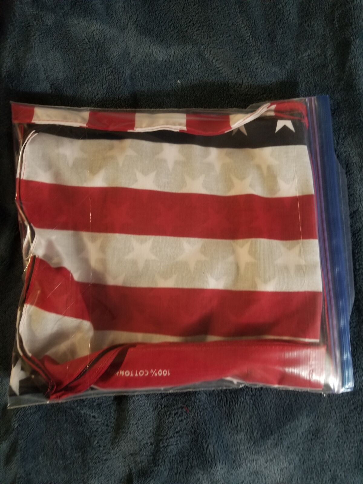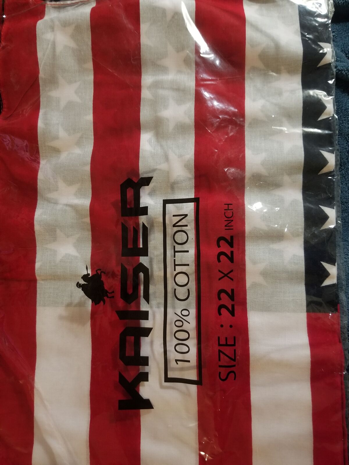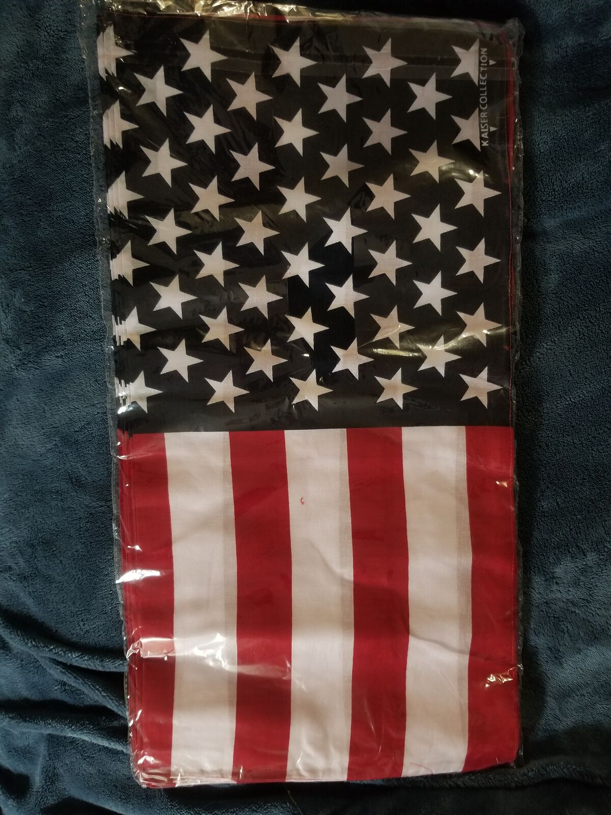 PayPalOpen box/never used pack of 4 American Flags bandannas. Very good quality material and Large size!