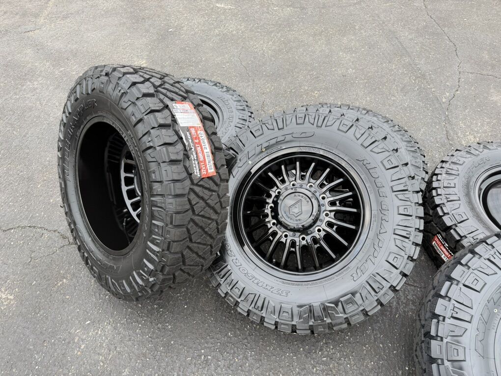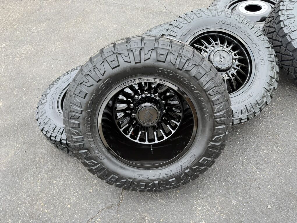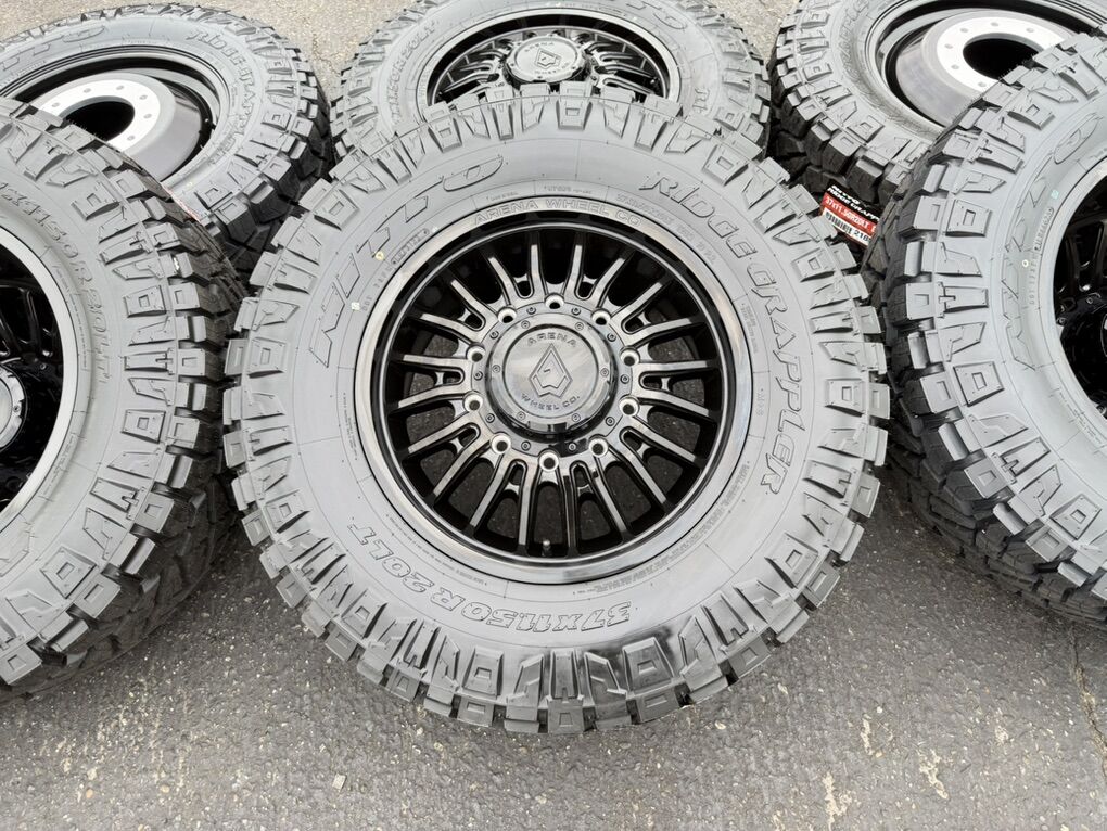 ApplePayOn special! In stock available today!!! 6 Dually Arena Thunder wheels Gloss Black and Milled 20” 10x225mm bolt pattern. Mounted and balanced on 6 37x11.50r20 Nitto Ridge Grappler tires. These fit 2005-2024 Ford F450 10 lug as well as 2008-2024 Dodge Ram 4500 and 5500. HUGE savings on this package!Massive savings!!!! Direct bolt on. Killer package! Must see in person