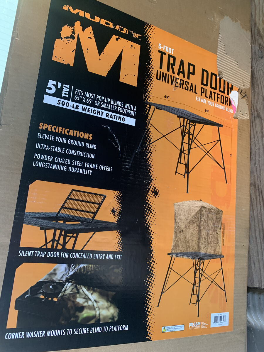 VenmoDescription: Upgrade your hunt with this brand-new, never-assembled Muddy Outdoors 5-foot elevated platform. The massive 65" x 65" steel base accommodates most standard ground blinds, providing a stable, elevated view.