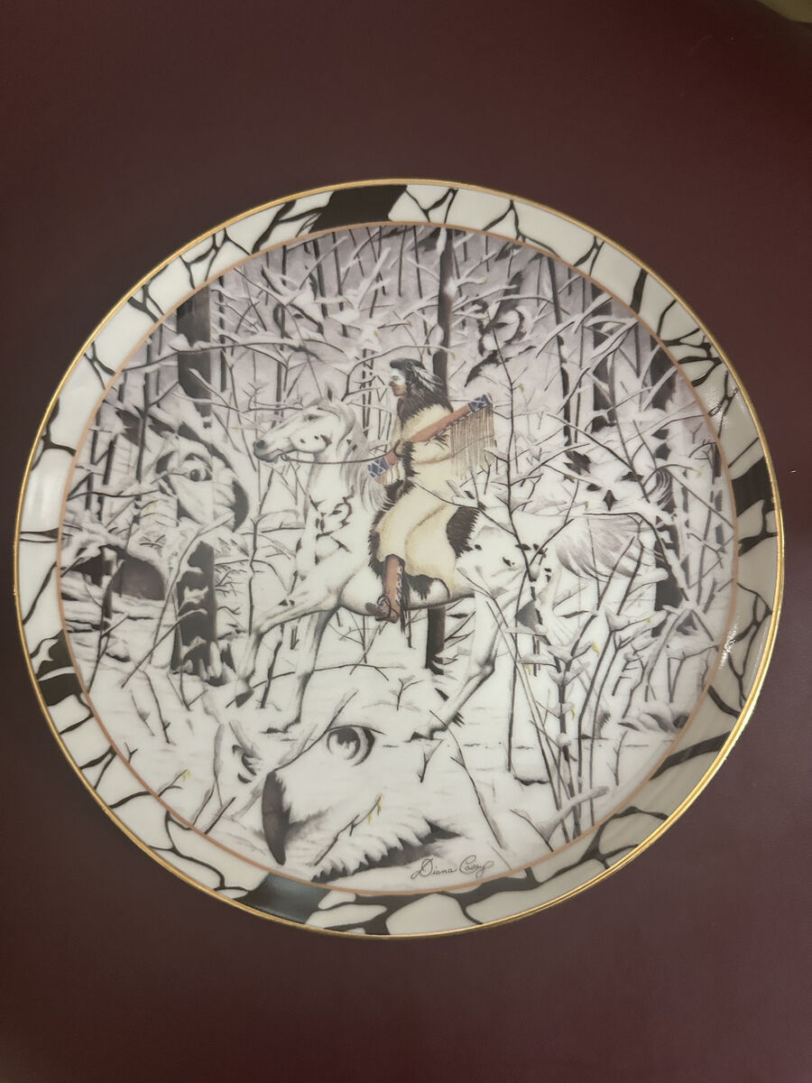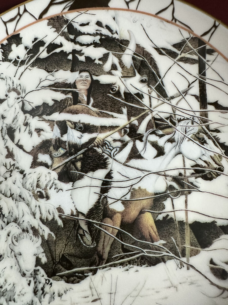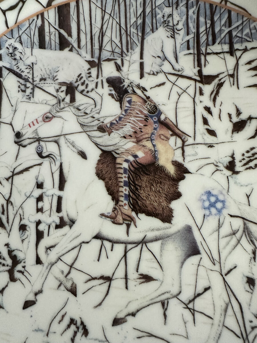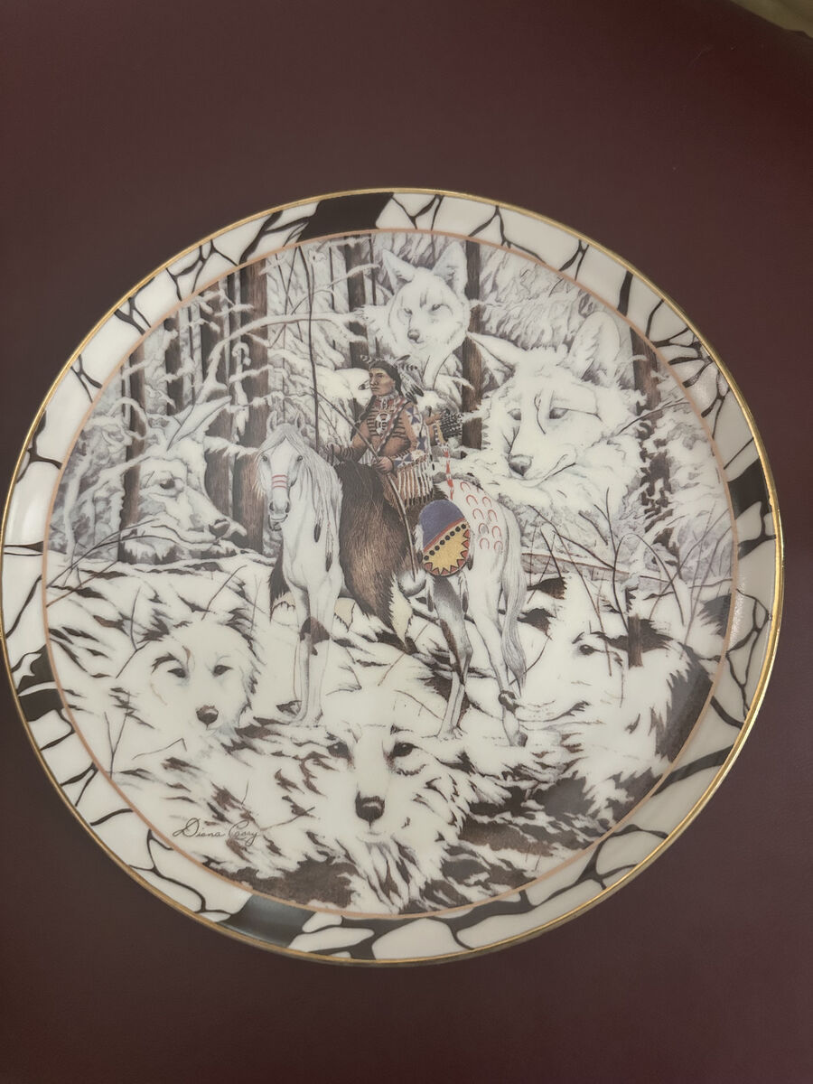 VenmoA Complete Series of 8, Bradford Exchange "Silent Journey" Native American Plate Set by Diana Casey features snowy landscape scenes with hidden images, showcasing wild animals and elements of Native culture. These decorative collector plates are made of porcelain and have a 24Kw gold rim. They were produced in the United States in 1994, using a hard-fire technique. Each plate weighs 11 oz and is part of the Bradford Exchange Silent Journey product line, making them a unique and vintage addition to any collection.