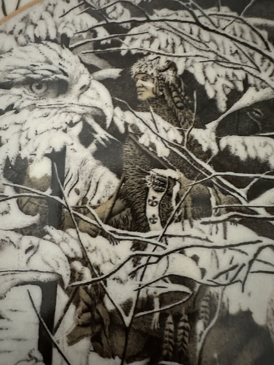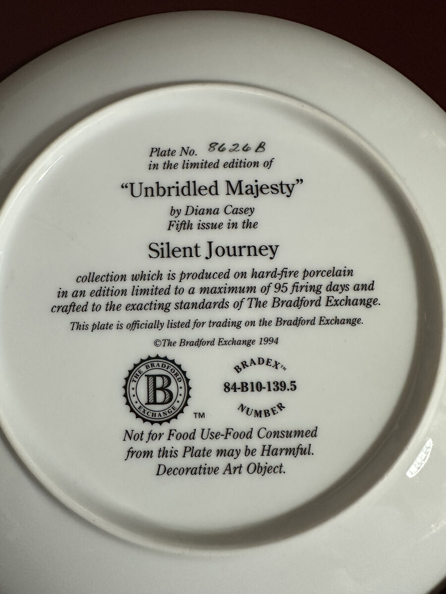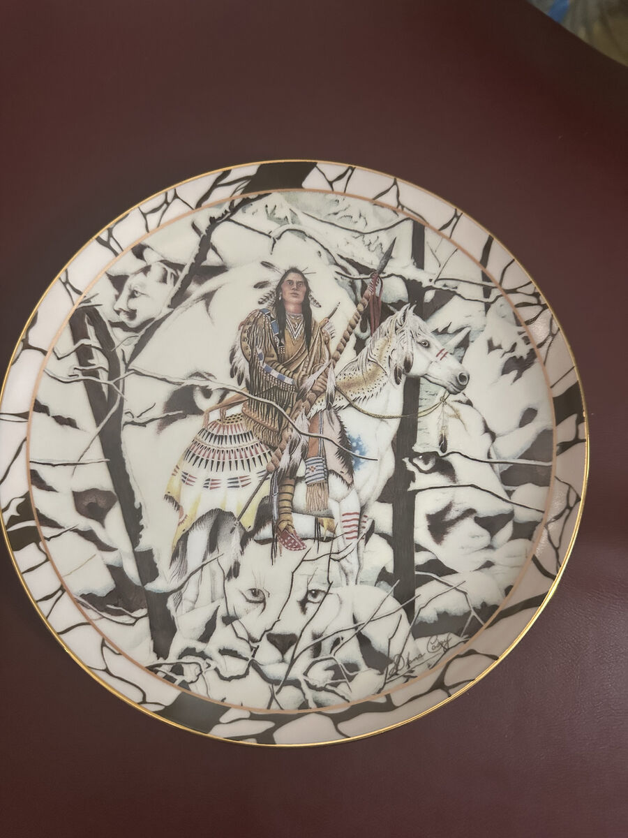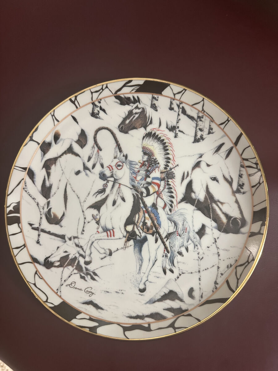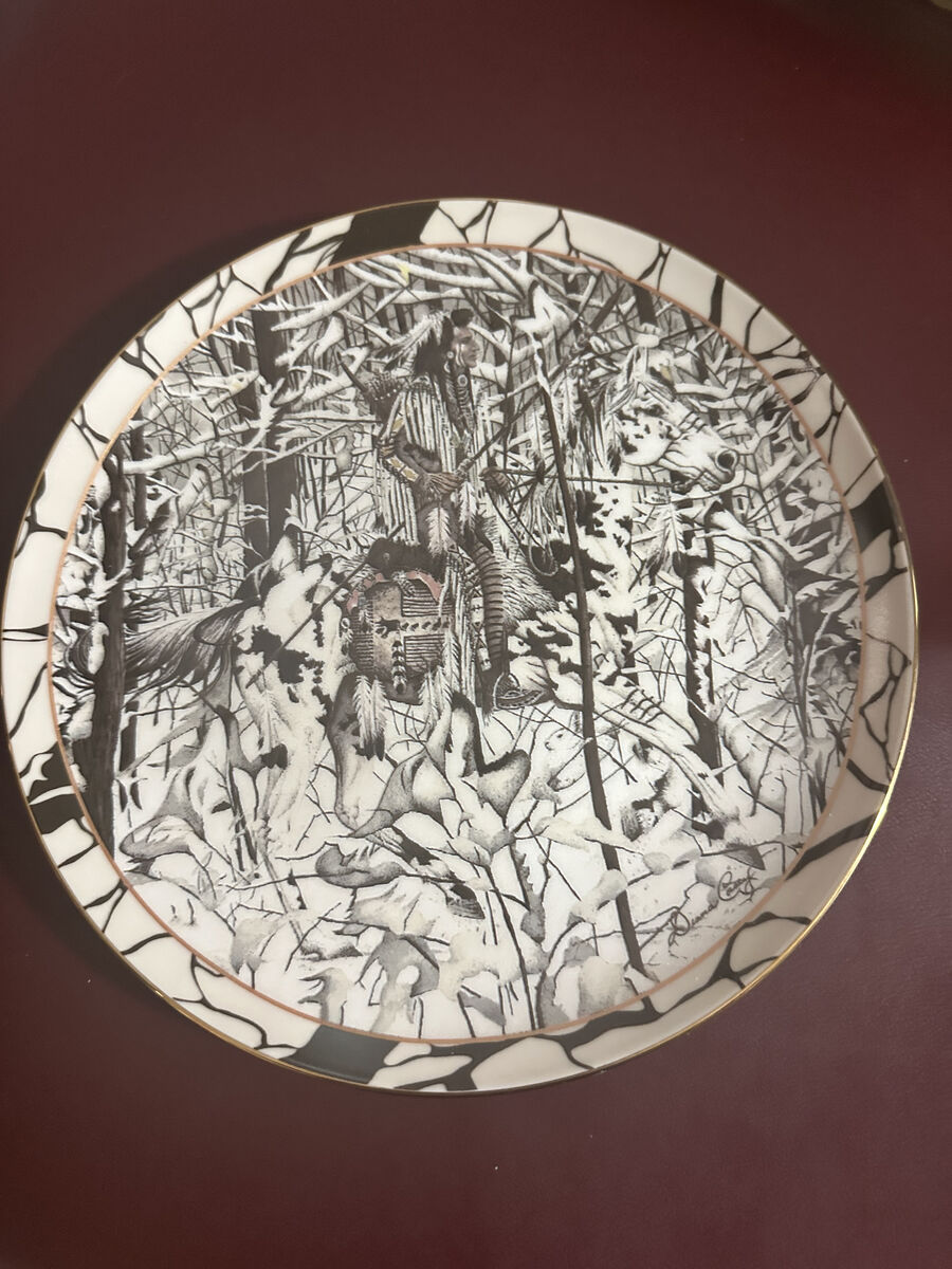 VenmoA Complete Series of 8, Bradford Exchange "Silent Journey" Native American Plate Set by Diana Casey features snowy landscape scenes with hidden images, showcasing wild animals and elements of Native culture. These decorative collector plates are made of porcelain and have a 24Kw gold rim. They were produced in the United States in 1994, using a hard-fire technique. Each plate weighs 11 oz and is part of the Bradford Exchange Silent Journey product line, making them a unique and vintage addition to any collection.