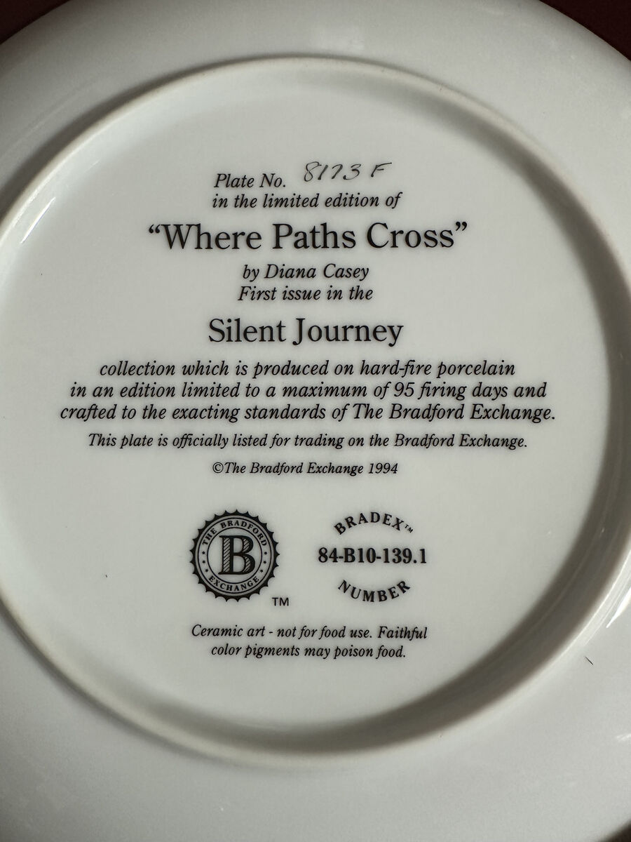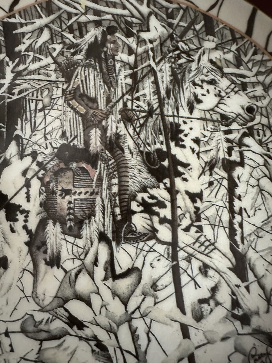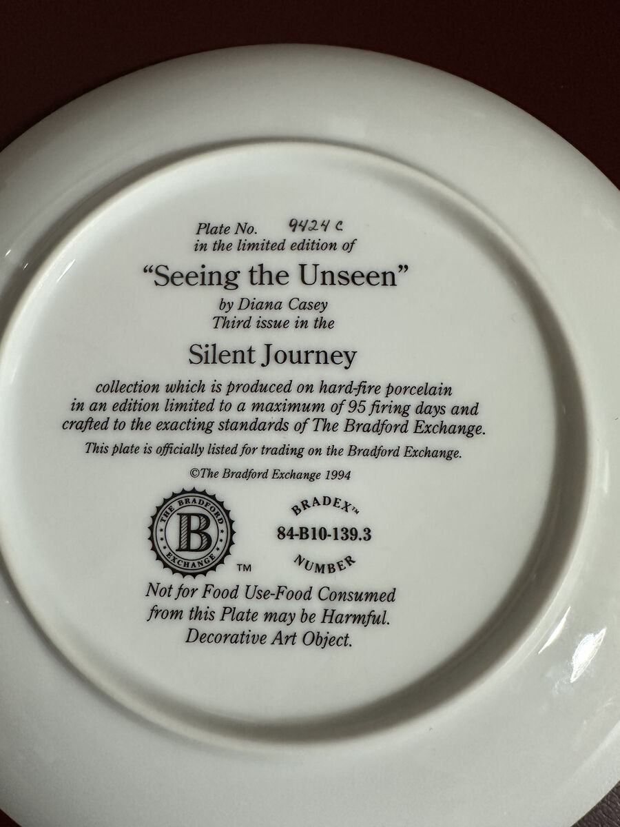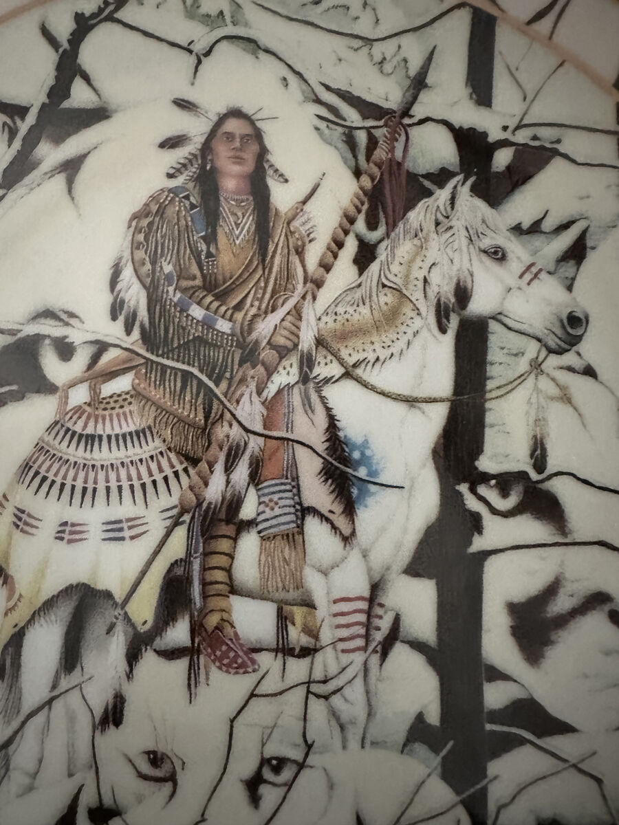 VenmoA Complete Series of 8, Bradford Exchange "Silent Journey" Native American Plate Set by Diana Casey features snowy landscape scenes with hidden images, showcasing wild animals and elements of Native culture. These decorative collector plates are made of porcelain and have a 24Kw gold rim. They were produced in the United States in 1994, using a hard-fire technique. Each plate weighs 11 oz and is part of the Bradford Exchange Silent Journey product line, making them a unique and vintage addition to any collection.