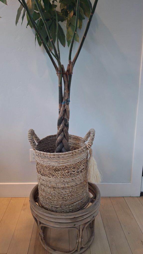 7.5 feet tall. Great for a corner with furniture in front. Braided stem. Pot sits inside the basket. the plant is $36 if you'd like the basket with it it's another $18. you can have the stand that it sets on.