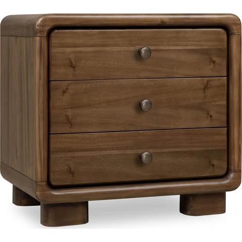 VenmoBoka 3-drawer nightstand made from solid acacia wood in the Impala finish. Simple, modern look with a solid, substantial build. Slightly taller profile with extra storage compared to the 2-drawer version.