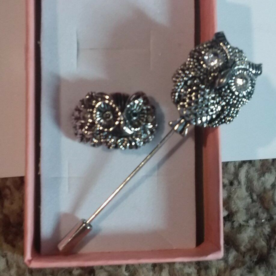 silver owl ring and stick pin...pin has rhinestone eyes...comes in a gift box