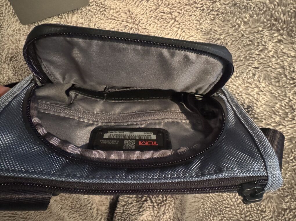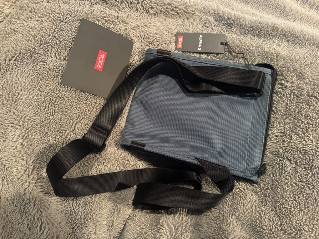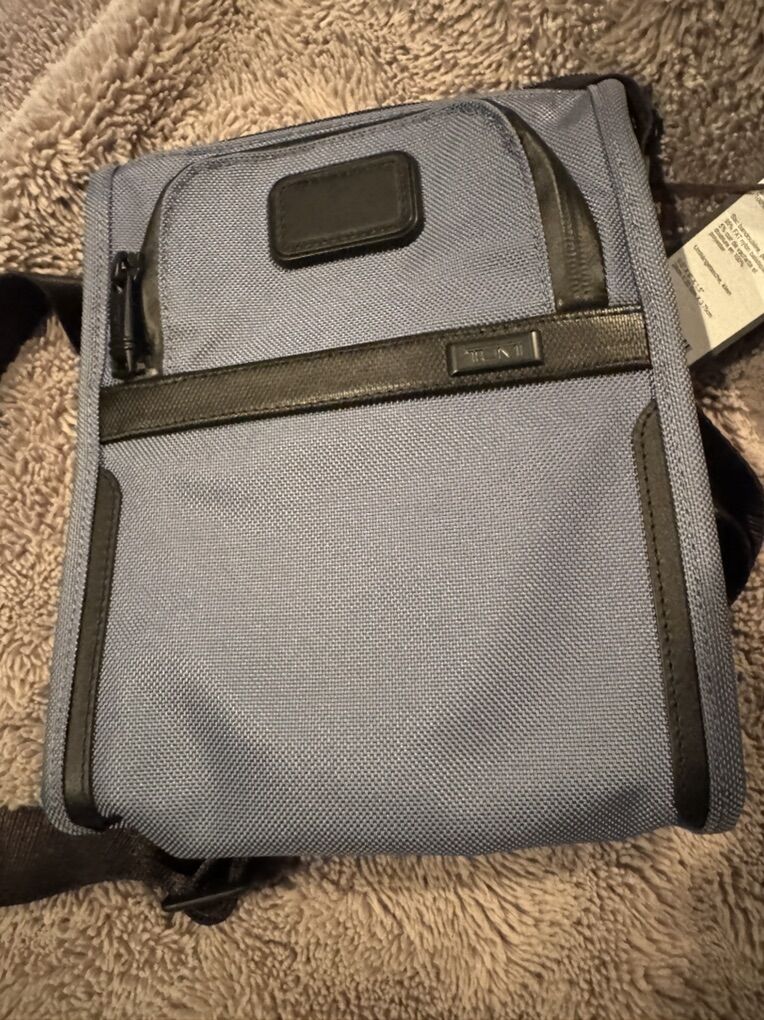 This listing is for a super high quality TUMI product. It’s listed as a “pocket bag small” made of ballistic nylon and leather accents. It measures 9.5“ x 8“ x 1.5“. It retails for $300+ tax and shipping. First $180 cash takes it home. Brand new with tags in a cool slate blue color.