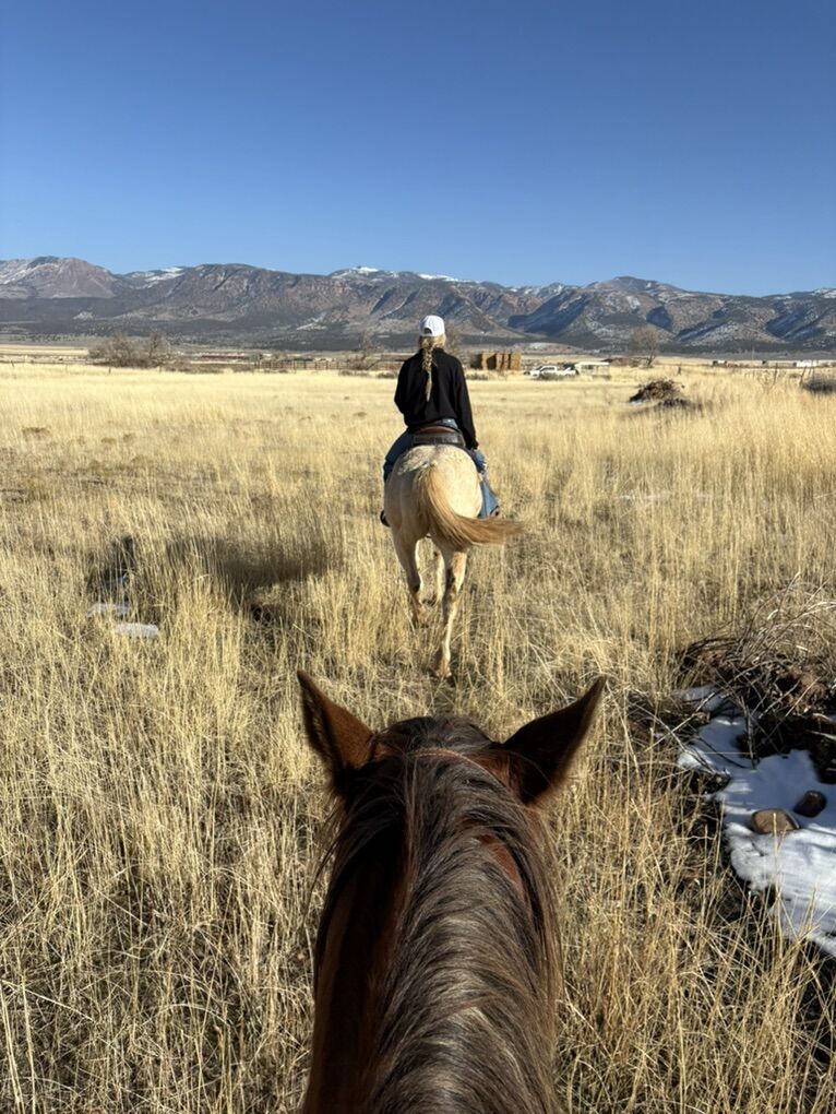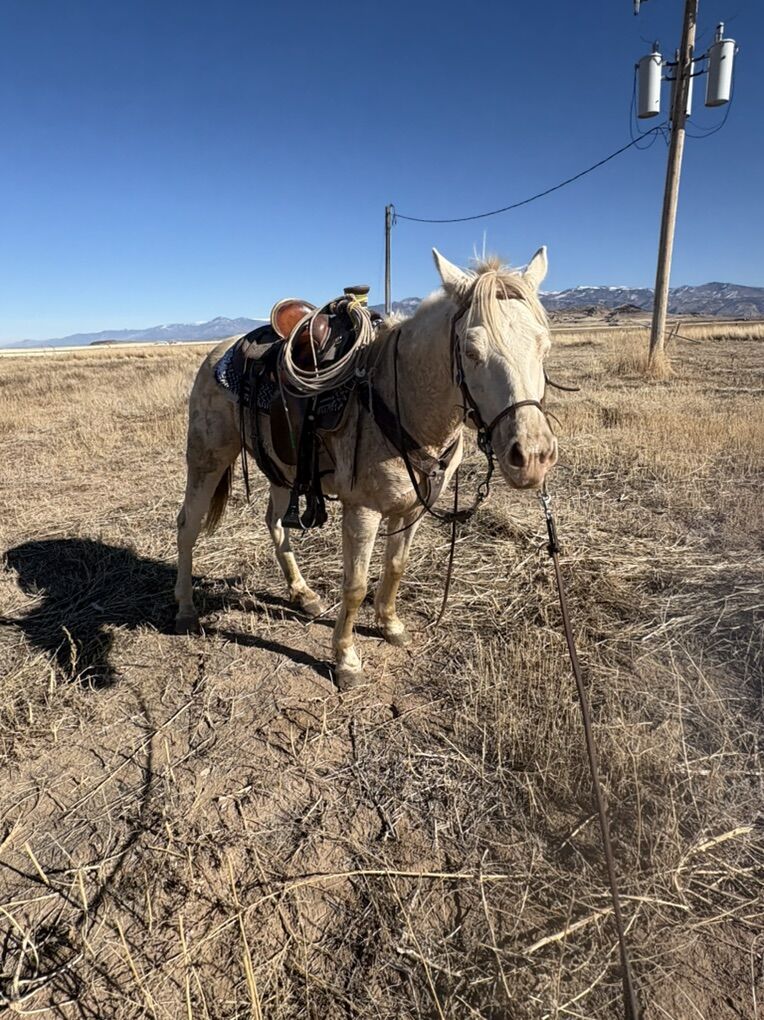 This horse has a ton of go. He walks out like he has somewhere to be. It doesn’t matter what direction you’re going either. I’ve only owned him for a little while so I don’t know a ton about him. Somebody has put a ton of time into this horse though. Somebody started him right but now he just needs someone to keep using him. Nothing spooks him. I’ve done all shorts of things on him and he handles it all great. You can pick all four feet up. You can spray him off. I’ve crack bull whips off him. I’ve swung a rope on him but I haven’t had the chance to actually rope something yet. He loads and stands tied. He’s hobble broke. Like I said he has a ton of go but he is a quiet horse. The reason he is cheaper though is because his hind legs don’t track normal. It doesn’t seem to bother him though. I have had a couple people come look at him and the best guess we have is he got hurt when he was younger and because of the way it healed he doesn’t track right. I’ve been ranching on him and he has held up just fine so far. I’ve got a ton of videos of him that I can send to anyone that is interested. Call or text 435-253-1625 with any questions. Anyone’s welcome to come look at him.