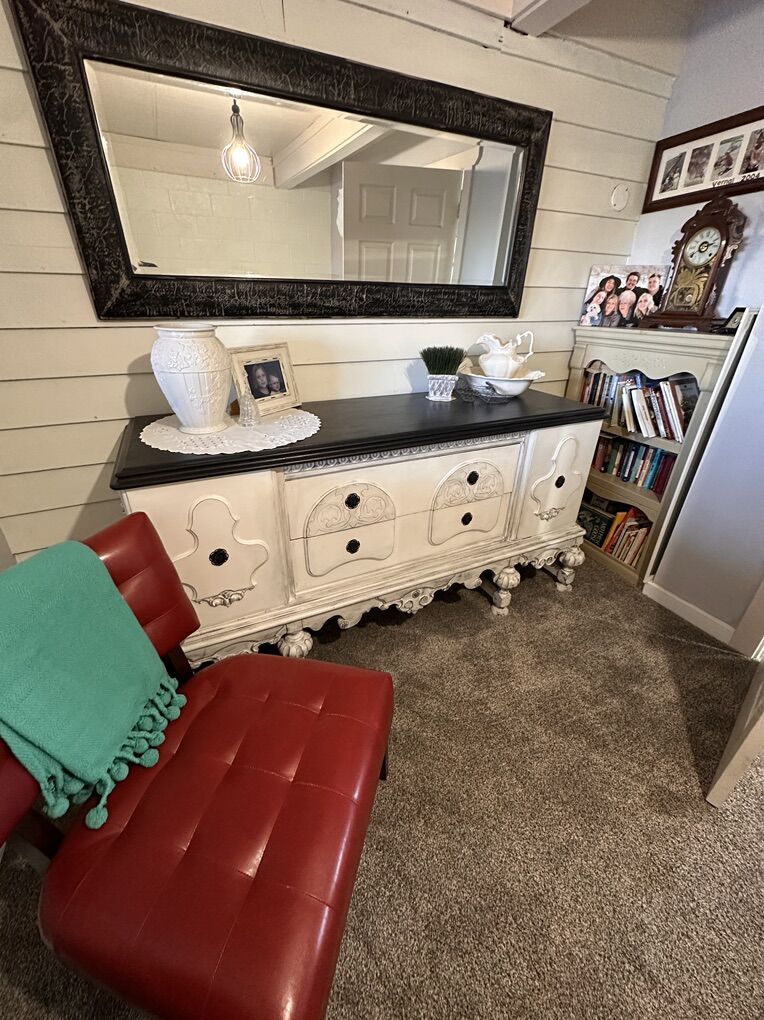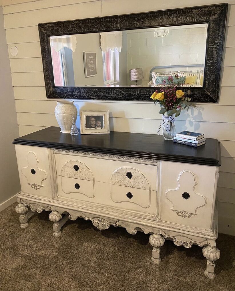 This dresser has been refinished would look beautiful in the kitchen as a buffet hutch and will also store many of your fine dishes or table cloths or could be used in a bedroom the mirror above it is also for sale for $100