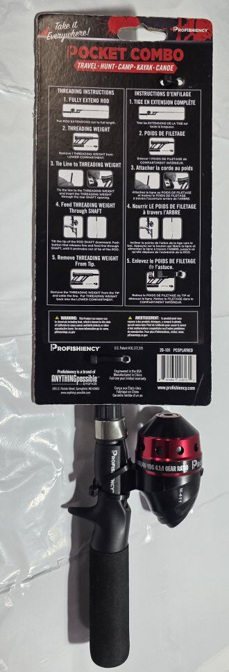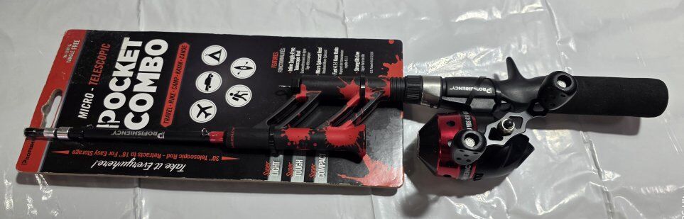 NEW ProFISHiency Tangle-Free Pocket Combo Telescoping Fishing Pole | Adjustable Lightweight Rod and Reel for Adults and Kids | 4.1:1 Gear Ratio | Pre-spooled 6-lb Fishing line | Red Splatter. This lightweight fiberglass rod is compact and portable, making it a breeze to carry with you on all of your fishing adventures. Sometimes the best honey holes are off the beaten path, and carrying a 6-foot pole on your excursion can be a real chore. The telescoping rod retracts to a convenient 18" so you can store it easily into a backpack or tackle bag. Now the hike to that beautiful lake or the journey in your canoe or kayak won't seem so intimidating with this retractable fishing rod. See all photos, text message is better, see my other adds, thank you.