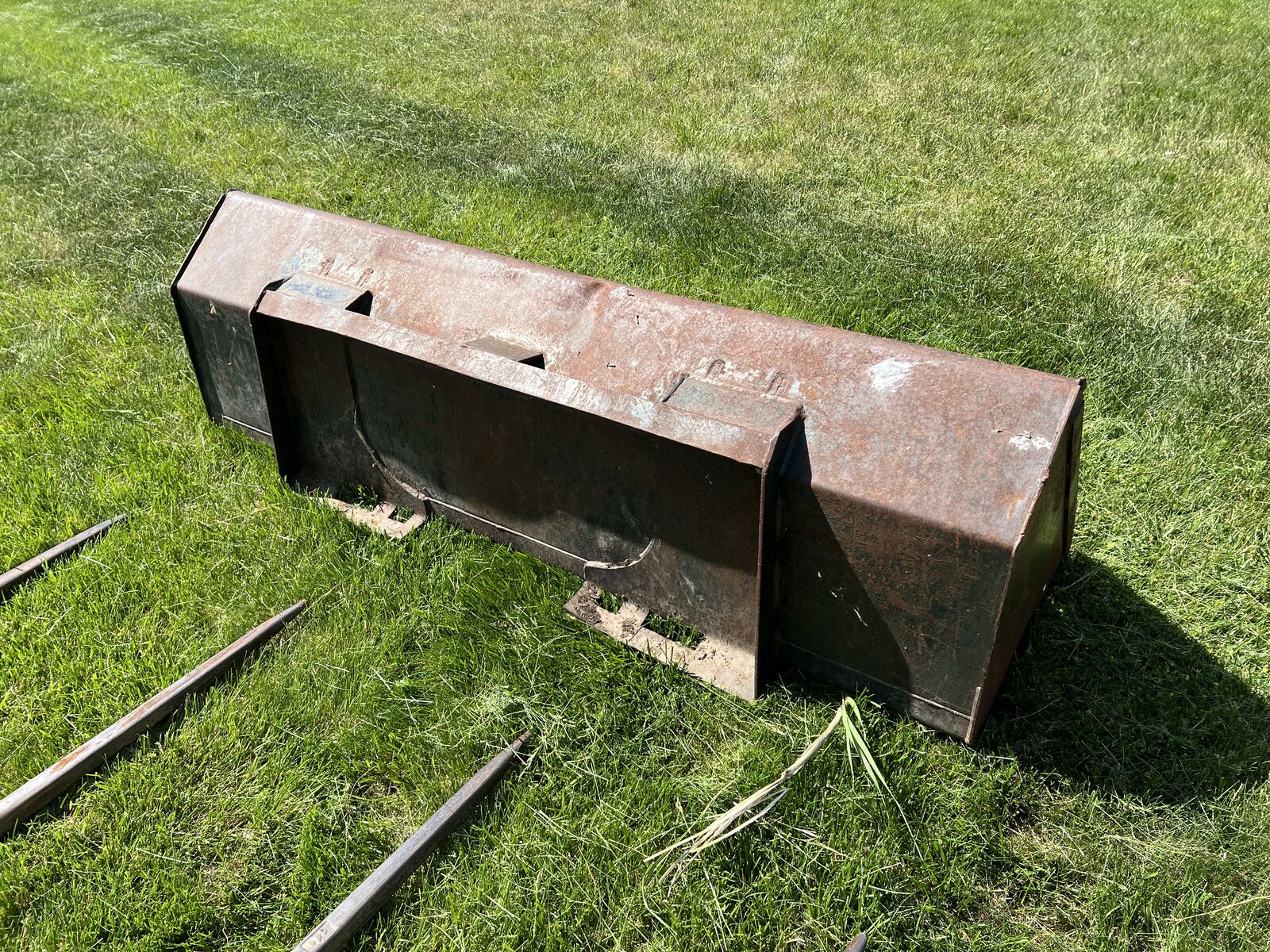 Hay fork - The hydrolics are rated for about 1600 lbs, but you have to tip the hay bales back, they can't be hanging on the end of the forks.