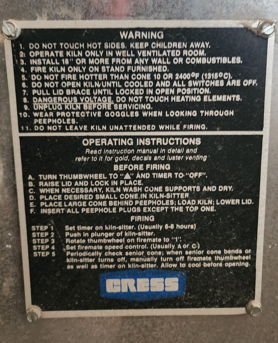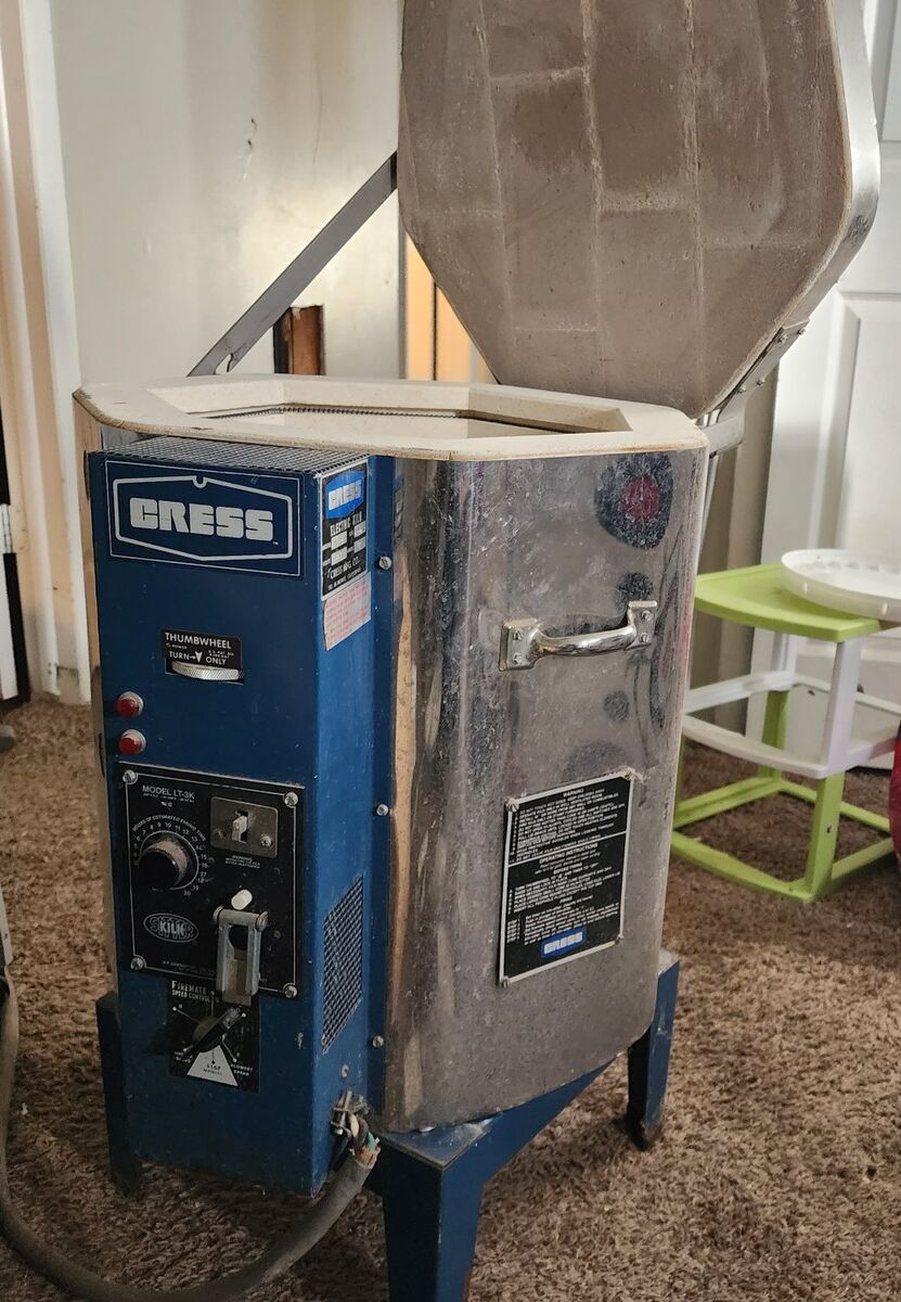 This a near perfect Cress LT-3K ceramics kiln. All coils are in perfect shape. All electrical near perfect, showing age only. No damage to any inner workings or parts. Comes with 3 different cone packages types. Low, Mid and High fire cones. (04, 05, 06) Also comes with a cone pack holder. Comes with one shelf. Includes several pieces of kiln furniture.