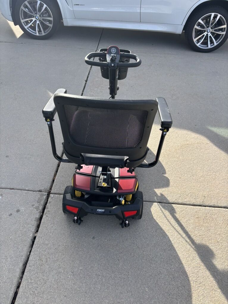 325 lb. weight capacity Standard 8 Ah airline-safe* lithium-ion battery pack or upgrade to the 16Ah MAXX** battery box for additional range o Maximum speed up to 4.1 mph at 325 lbs. 48.25” turning radius o Up to 5 miles (8Ah*); Up to 9.9 miles (16Ah** MAXX) per charge at 325 lbs. 17”x17” mesh back seat or 20”x18” compact, foldable seat with flip-up, height, and angle adjustable armrests Pride’s front and rear suspension CTS Suspension provides a smooth, comfortable ride over varied terrain Delta tiller with ergonomic wraparound handles lets you operate the scooter and rest your wrists Feather-touch disassembly permits simple frame separation with only one hand and easily disassembles into five super lightweight pieces High-intensity LED headlight on tiller Off-board charger port conveniently on your tiller Pride’s exclusive black, non-scuffing tires