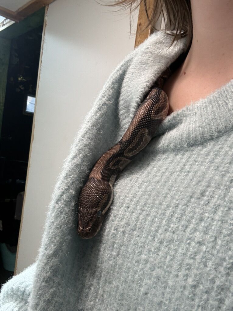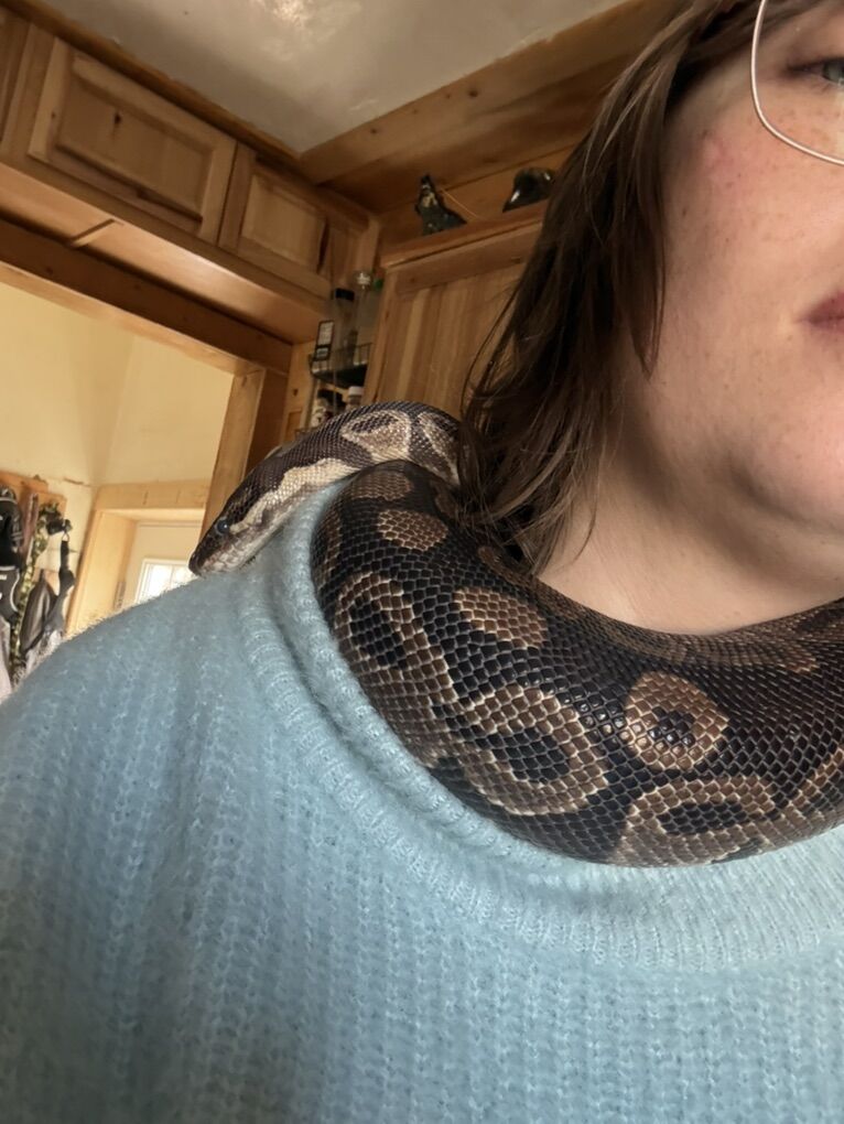 Hello, this is mama snake. I’m not sure her age but I know she no more then 3. She loves to cuddle and chill with you. She’s about to shed so she not as shiny as she normally is. She’ll come with her tank and everything in it.