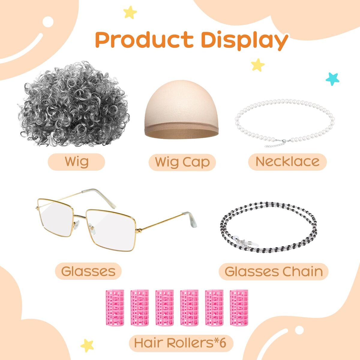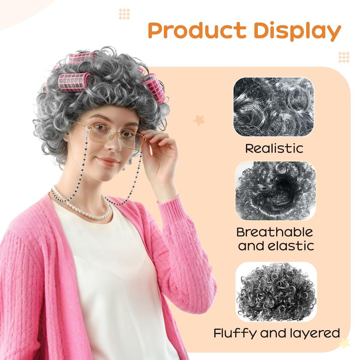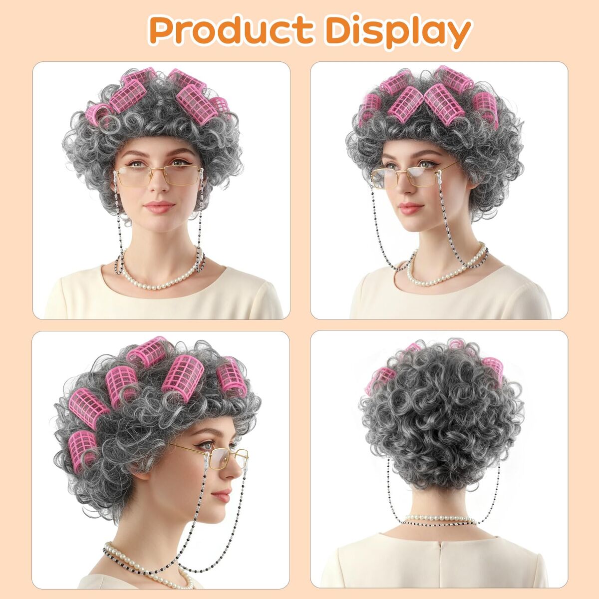 CashAppBrand NEW curly gray wig with pink curlers.