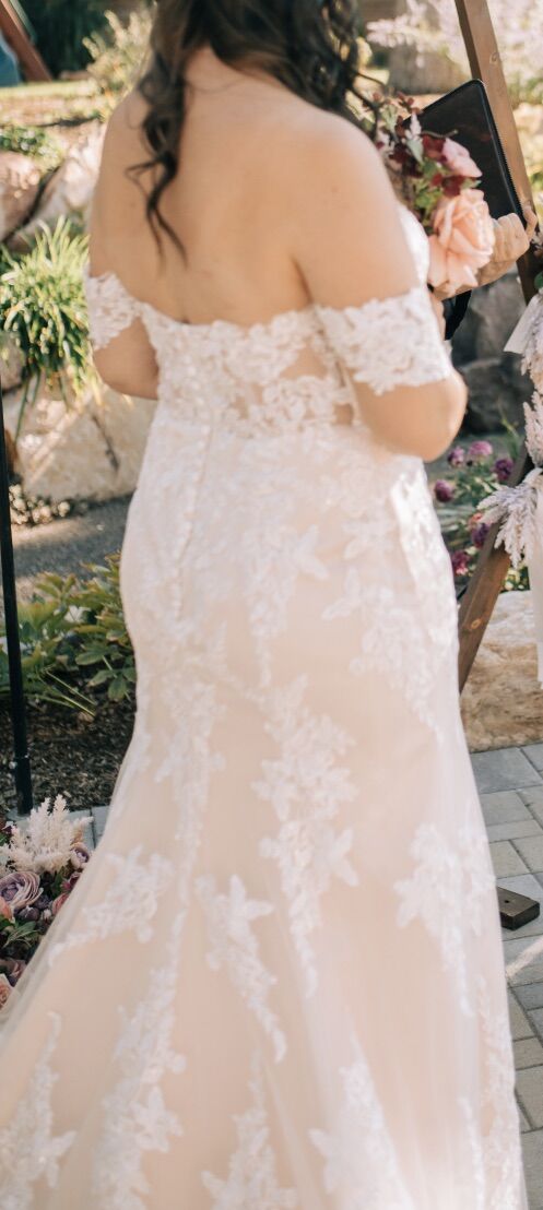 Gorgeous wedding dress with train. Off-white color. Size L. No stains, no odors. Looks brand new.