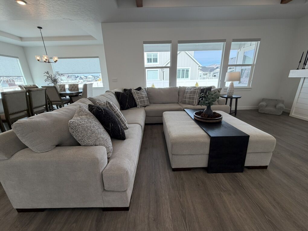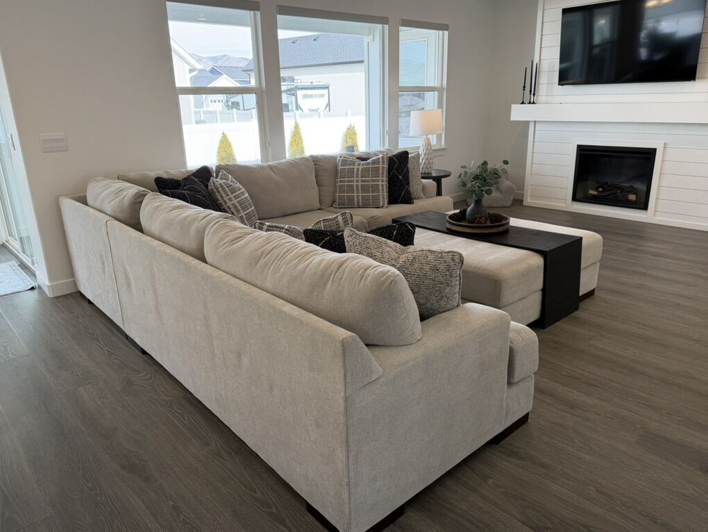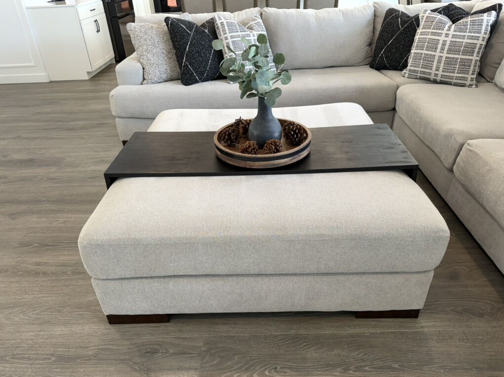 The sectional measures 130” x 130” and includes both the matching ottoman, pillows and black table in the price. Spacious, comfortable, and perfect for family rooms or entertaining.