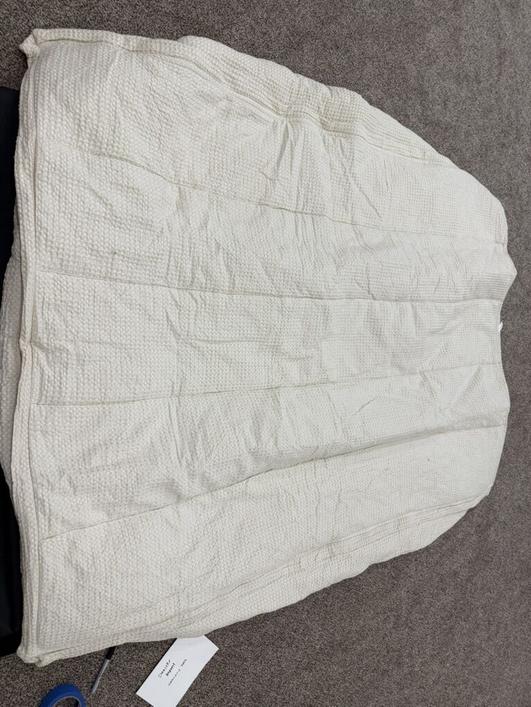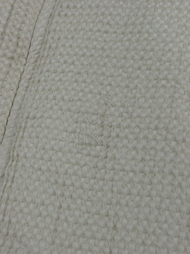 Has 2 shams and 2 cases and 2 sheets. 2 small Holes (one on top; one towards very bottom fitted piece). Few loose threads. Sheets have a few minor dirt type marks. 75JAN