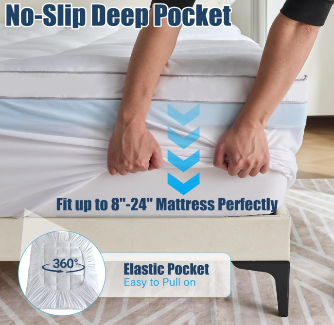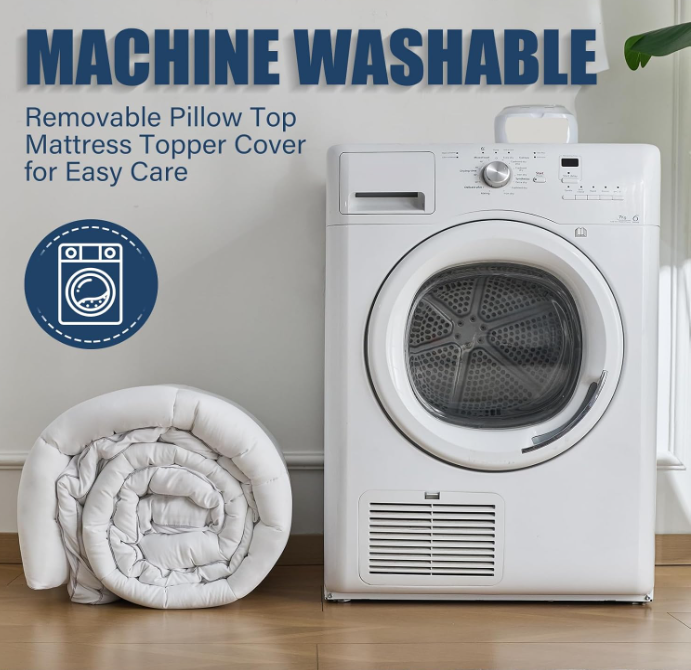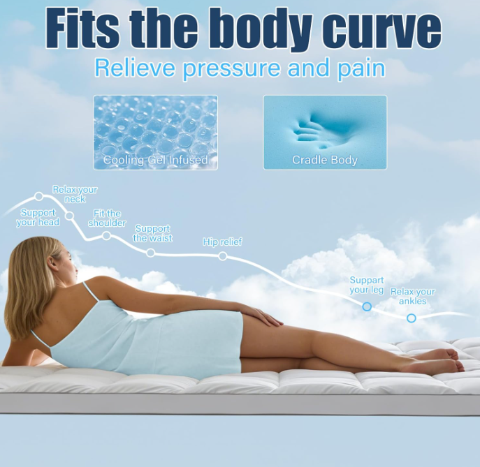 ZelleDual-Layer Design: Our memory foam mattress topper adopts a dual-layer structure design, combining a 2-inch-thick cooling gel memory foam layer with a 2-inch-thick quilted pillow top layer filled with down alternative. It features both strong support and a cloud-like soft touch, bringing a refreshing new experience to your mattress and helping you create a sweet and comfortable sleep enjoyment.