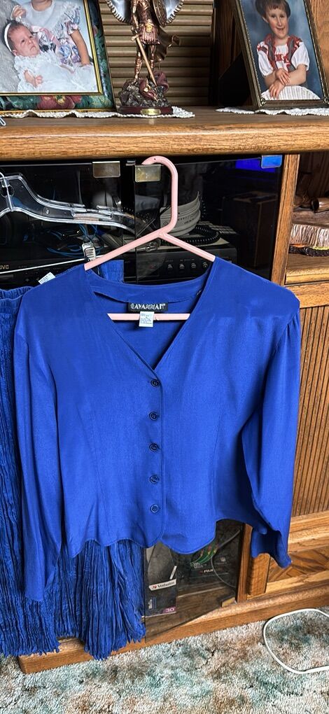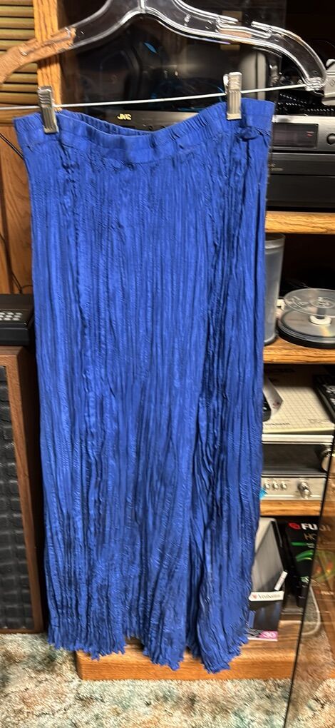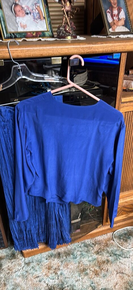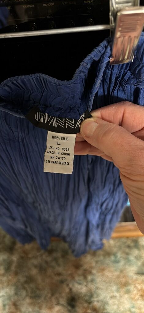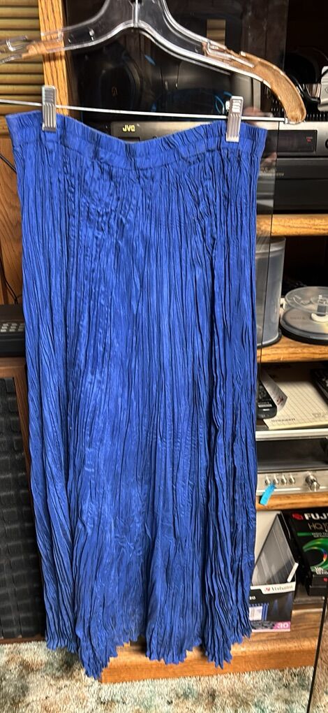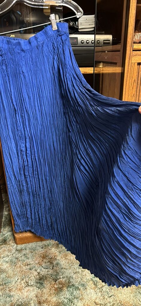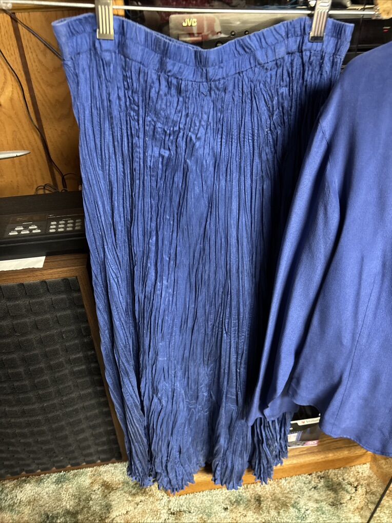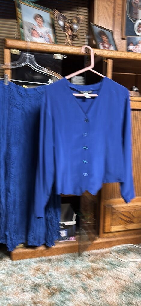 VenmoSavannah 100% silk Made in China 2-piece maxi skirt and blouse set Skirt is a maxi crinkle skirt approximately 34” length, elastic waist Sometimes called broomstick style Long sleeve button front v-neck blouse Beautiful blue Easy care. Wash in cold water. Do not dry clean. Care instructions on tag Great condition. See video and photos. I noticed one spot area on sleeve. I did not try to wash it out. See photo where it is shown. No rips Works for casual or dressy occasions Non smoking home Sandy porch pick up
