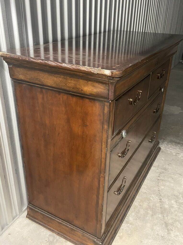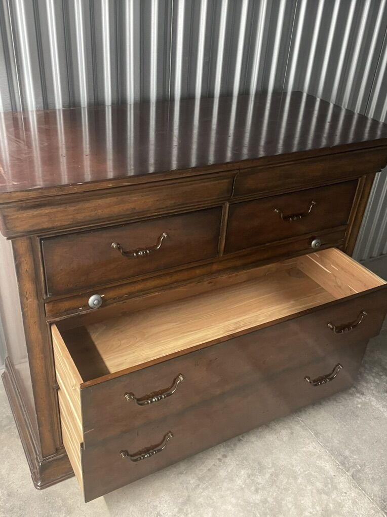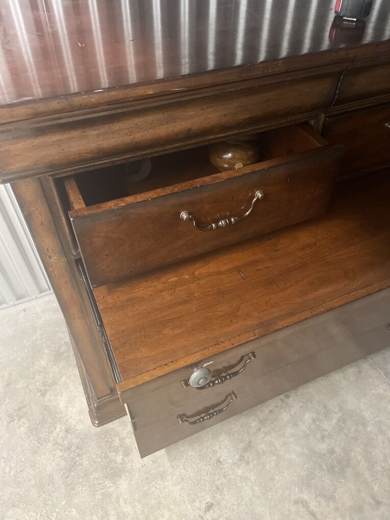 • Heavy, well-built solid wood — not cheap particle board • Two large drawers + two smaller top drawers • Drop-front drawer with latch — perfect for folding down as a workspace • Built-in shelf/center ledge adds character • Some surface wear/scratches (shown), but structurally solid