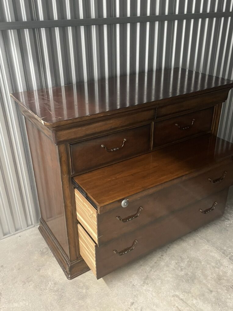 ApplePaySolid hardwood dresser/cabinet with classic design and a unique drop-front drawer that folds down into a little desk/work surface. Great as a bedroom dresser, office credenza, or entry piece.