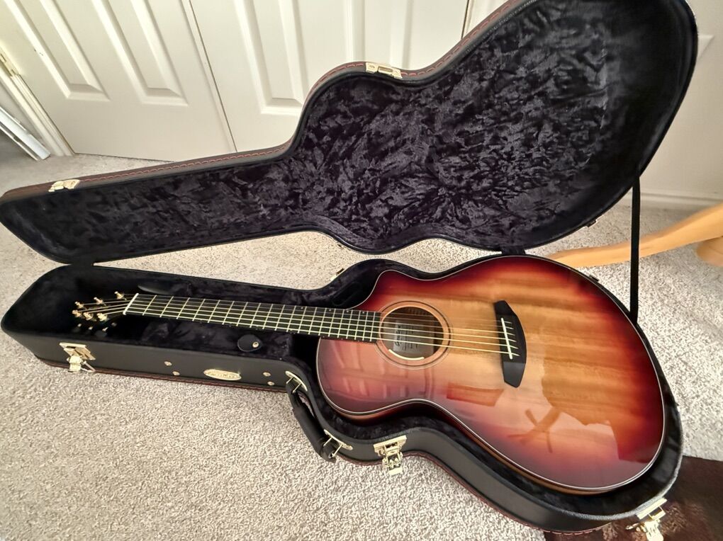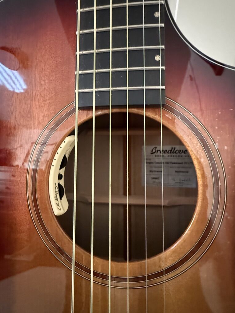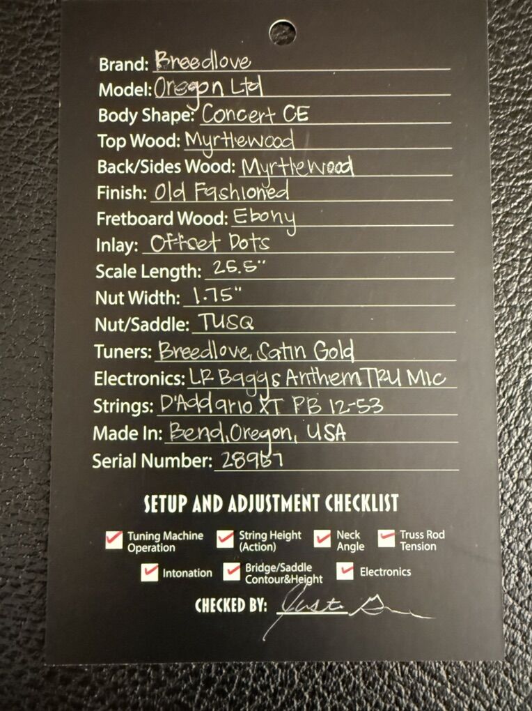 Concert CE, Myrtlewood top back and sides. Old Fashioned finish, Ebony fretboard, scale length 25.5”. Nut Width 1.75”, Breedlove satin gold tuners. LR Baggs Anthem Tru Mic electronics.